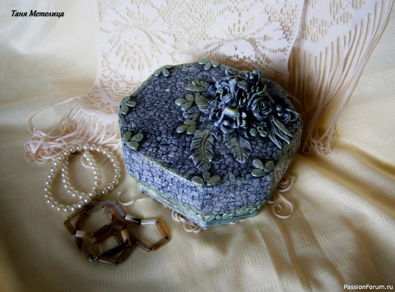 И последняя шкатулка сделана из коробки от конфет. Декорировала лепкой из воздушного пластилина, яичной скорлупой, семенами арбуза. Красила акриловой гуашью под камень, лак ХВ.