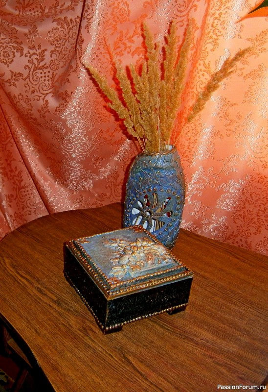 Спасибо Вам большое за комментарий и добрые пожелания!!! Очень приятно, когда работа нравится))) Отвечаю на Ваши вопросы. Воздушный пластилин после высыхания напоминает высохшую монтажную пену, которую заливают при установки окон и дверей (видимо состав похожий, покупаю на Уалдберриз). Декор из него я клею на ПВА, хорошо клеится и на бумагу и на стекло, покрытое акриловой краской. Декор из воздушного пластилина сначала покрываю жидкой шпатлевкой, а потом крашу акрилом обычно (все это делаю для повышения прочности декора, это мой личный опыт). Такой декор менее устойчив к механическим повреждениям, чем декор из самозатвердевающей глины. Крупные элементы стараюсь не делать, но тонкие завитки, листики, цветочки мелкие из него хороши. Декор из воздушного пластилина долговечен, если изделие не будет регулярно падать))) Для шкатулки из пластиковой банки я использовала оконную замазку (это тоже пластилин как детский, только дешевле и белого цвета). Еще использую пластилин, которым ребенок наигрался и бросил))) Он хорошо прилипает к пластику, стеклу, картону без клея, хорошо красится. Если что еще интересно или я не прояснила, то спрашивайте, я буду рада помочь)))