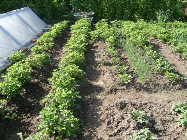 Это грядки с картошкой.Жарко было и сухо.Пришлось поливать.