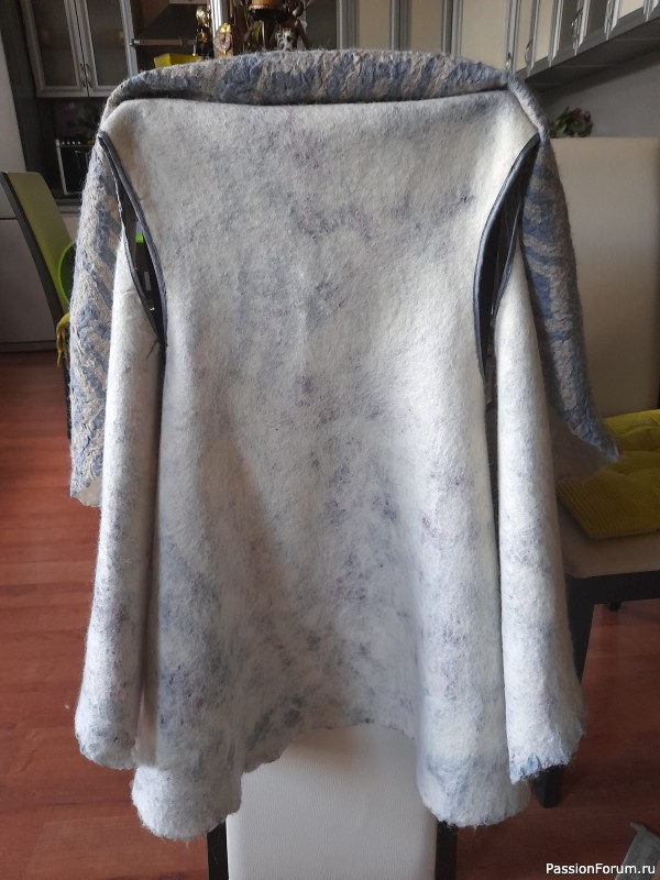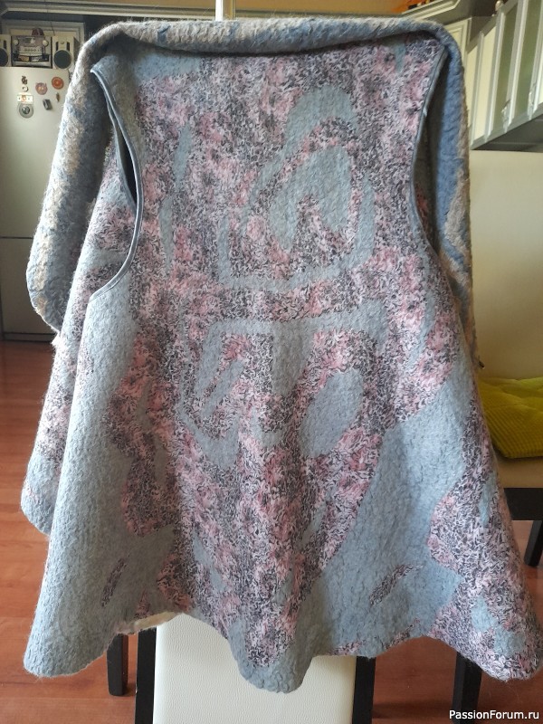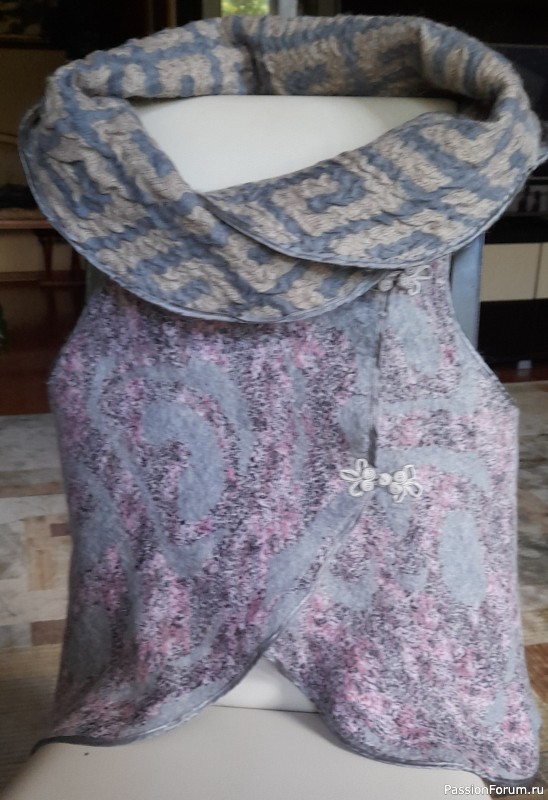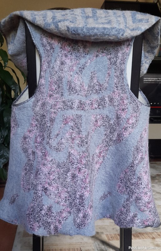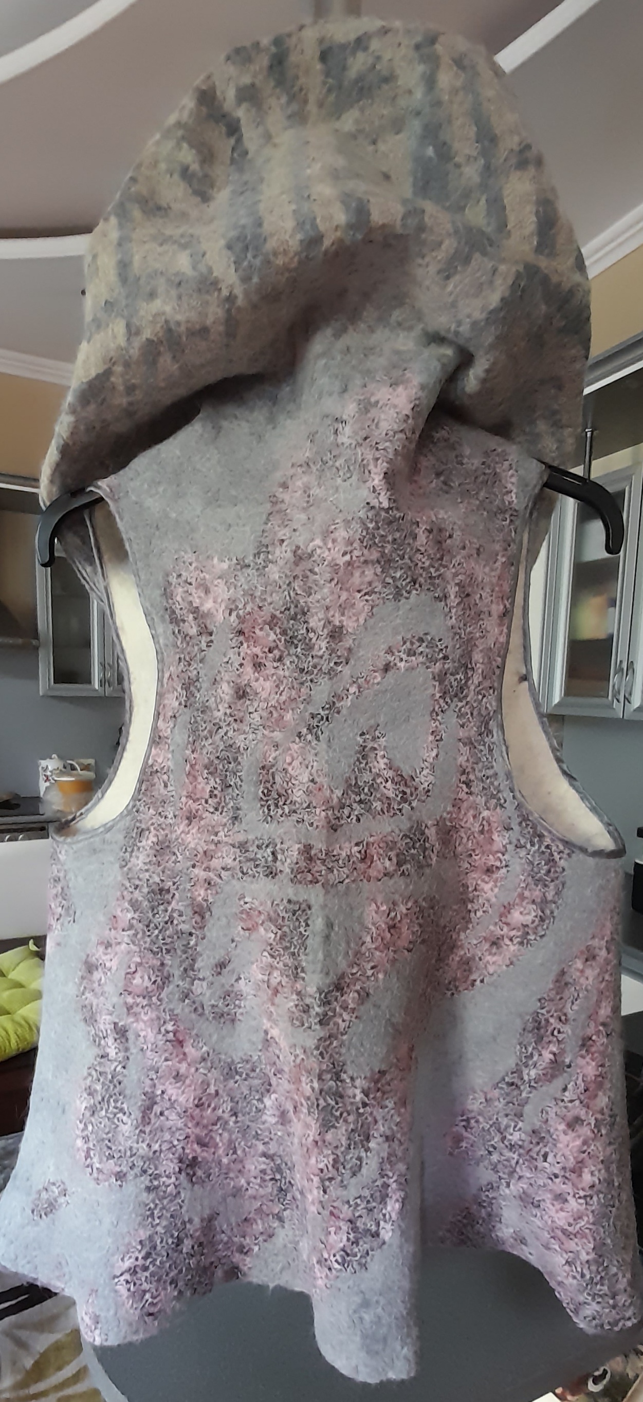 Все началось с этой жилетки, это самая моя первая работа, нетерпелось начачать и первая ошибка. Шерсть белая, материал серый, на отвороте видна была белая шерсть, пришлось со второго раза привалять воротник, сделанный отдельно