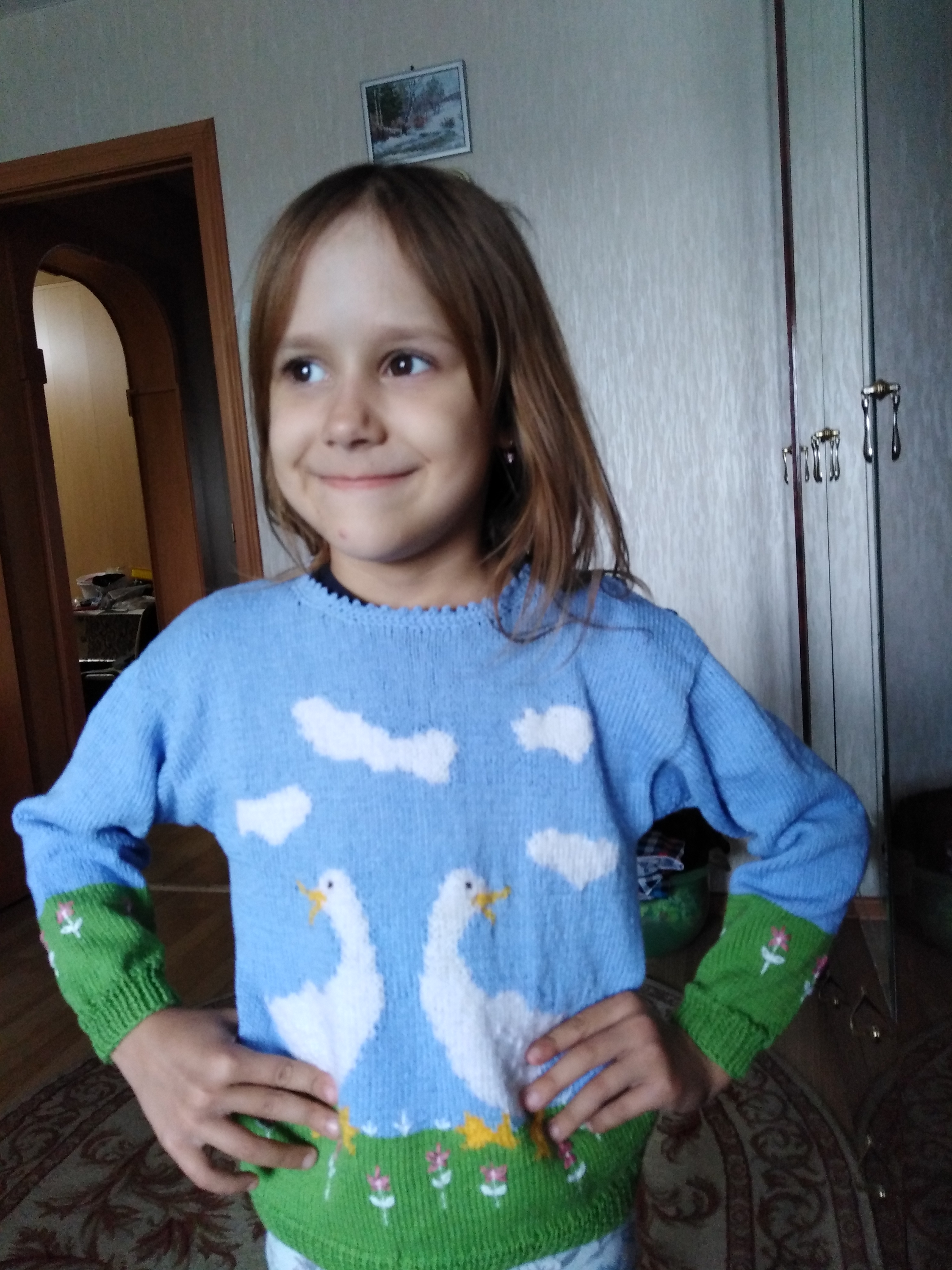 Девчушка, по-моему, очень довольна! Два веселых гуся просто красавцы. Яркий, жизнерадостный джемперок!
