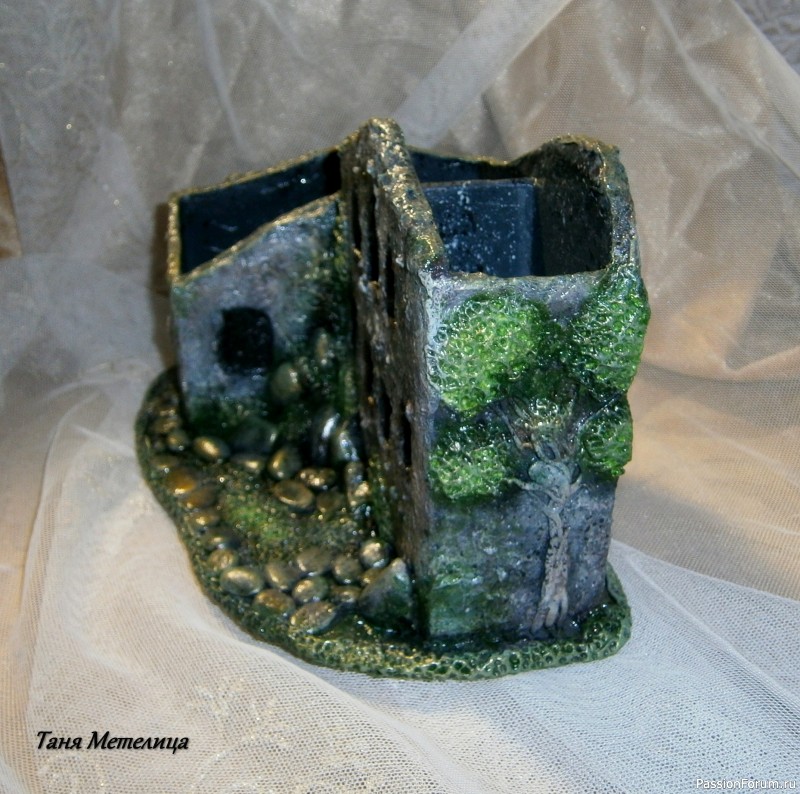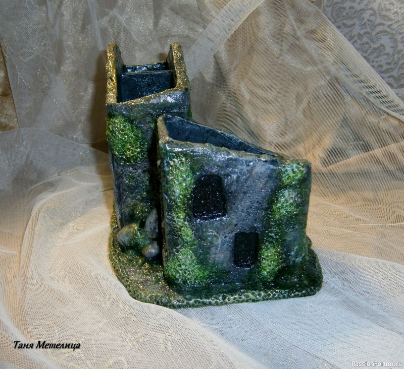 Здравствуйте, дорогие феечки! Мне почему-то всегда нравились руины. Есть места, конечно, где находится крайне неприятно. Но иногда нагромождение камней выглядит уютно и не хочется оттуда уходить. Вот и захотелось передать эти впечатления. А так как крыши у руин не бывает, то решила оформить в виде органайзера. И вещь в хозяйстве полезная и создает атмосферу)))