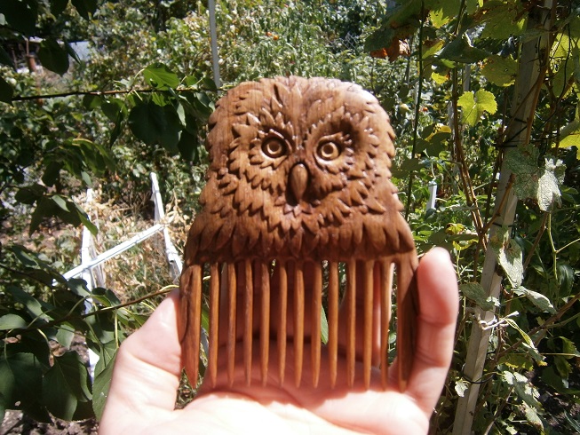 Доброго всем времени суток! Вот этот товарищ уже в пути... или в полёте? В-общем, поехал к хозяину. Странная деревяха попалась: тяжёлая, начальный цвет был с сероватыми пестринками, почему я её и выбрала. Но потом темнела, хоть ты что делай. Пыталась даже как волосы отбеливать. Вроде бы чуть-чуть получалось. Но когда покрыла восковой смесью, сов потемнел. И структура дерева какая-то странная, неоднородная. Излазила инет в поисках истины, ничего похожего не нашла. Короче, пришла к выводу, что при работе с любой деревяхой нужен пробник. И солнечная погода - не самое лучшее время для фото.