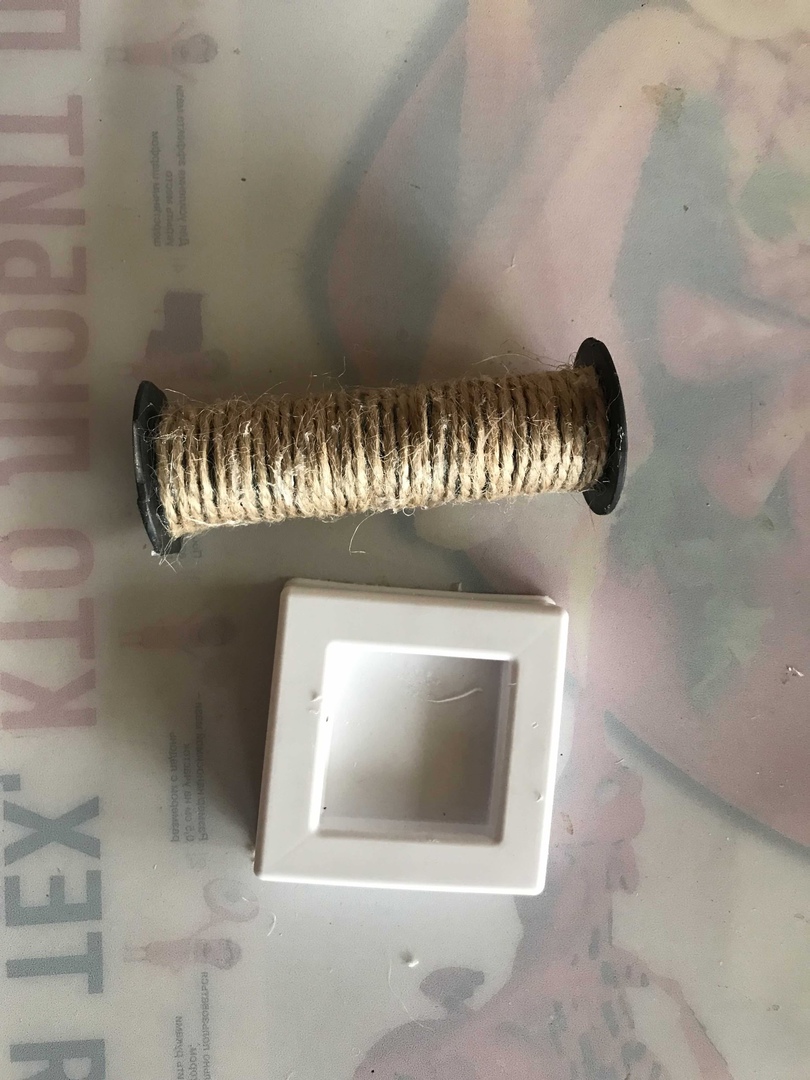 Для подставки я взяла какую ту коробочку(у меня давно лежали 2 шт,похожи от часов, коробочки пластиковые.)Ещё я взяла большую пластиковую катушку от ниток.Обмотала шнуром,но потом подумала, что много волосков от шнура торчит,надо что то с этим делать... Катушку плотно вставила в коробочку, пришлось чуть подрезать с боков края катушки, приклеила на горячий клей.