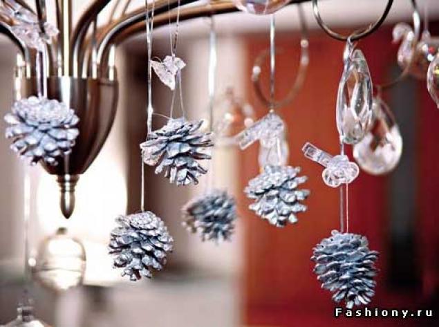 Гуляя с подругой в парке набрала еловых шишек, покрасила золотой краской из баллончика. И всё. Куда их применить, мысли не возникало. Теперь просто подвешу на ленточках. Красота!