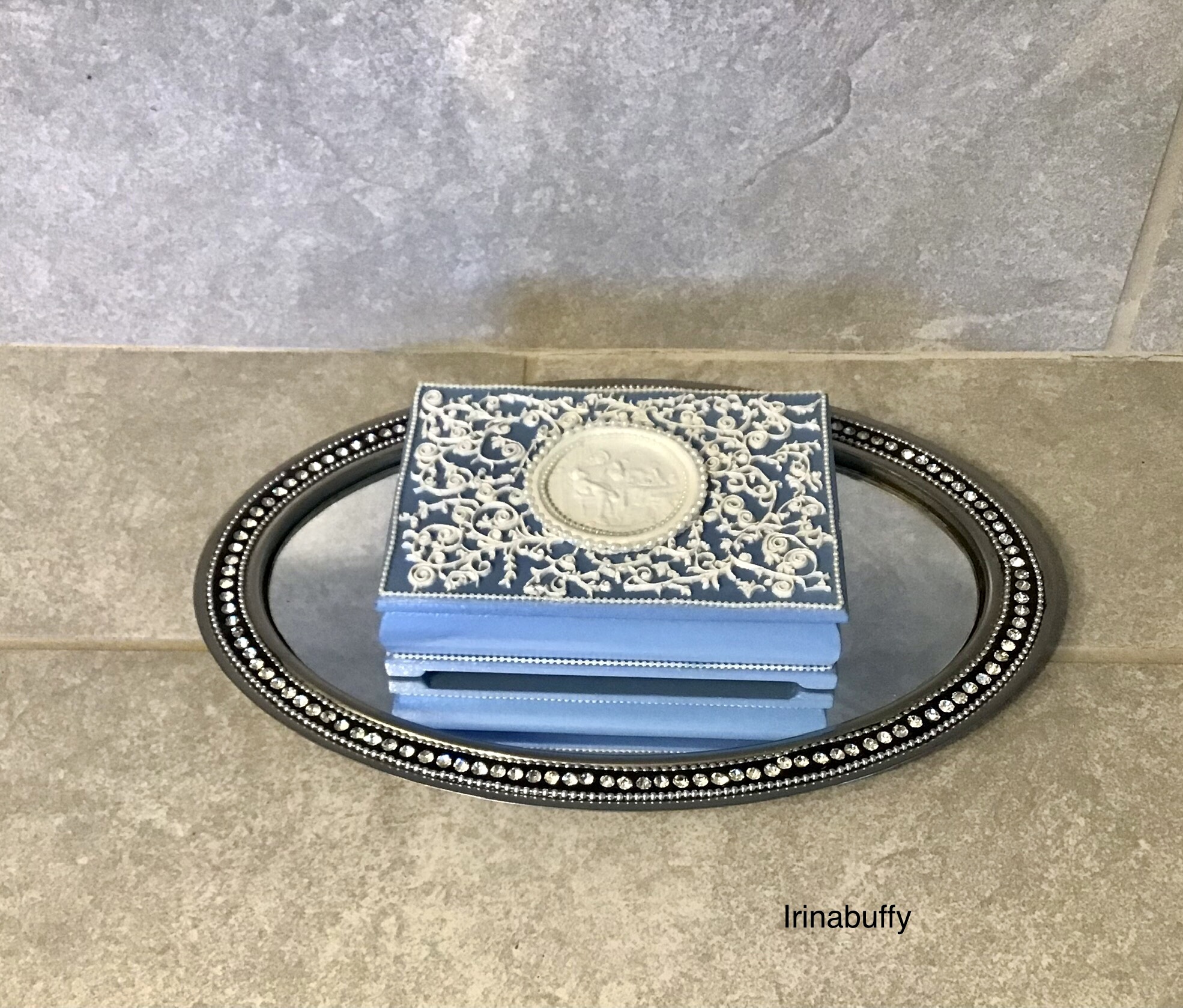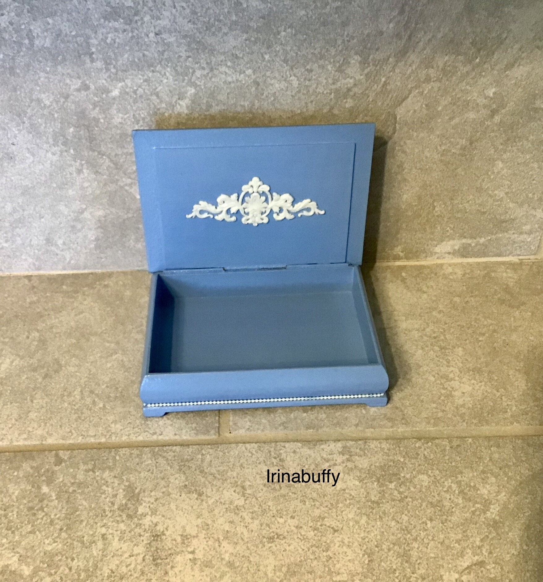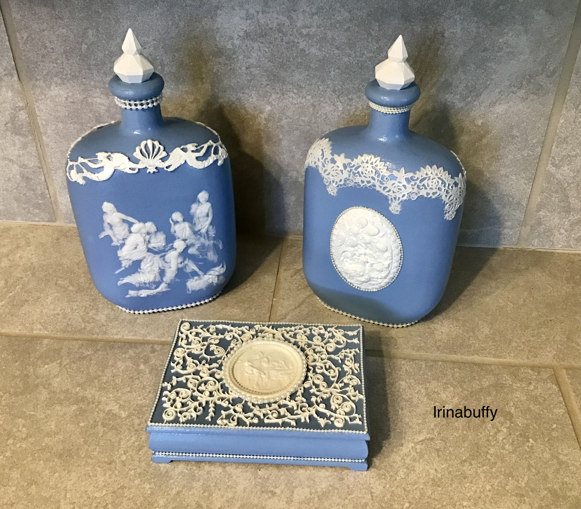 Всем доброго времени суток!Сегодня у меня наборчик бело- голубой,состоящий из двух бутылочек и маленькой шкатулочки.Тестирую в работе новые молды ,делая отливки из разных материалов: текстурной пасты,акрилового герметика,жидкого пластика.Поэтому различная толщина и цвет отливок.Для себя сделала вывод,что больше всего понравились отливки из текстурной пасты местного производства.Это молд с девушками,получилось полупрозрачно и качество устроило.Жидкий пластик тоже хорош,но более плотный цвет и текстура.Герметик не очень понравился,так как получились