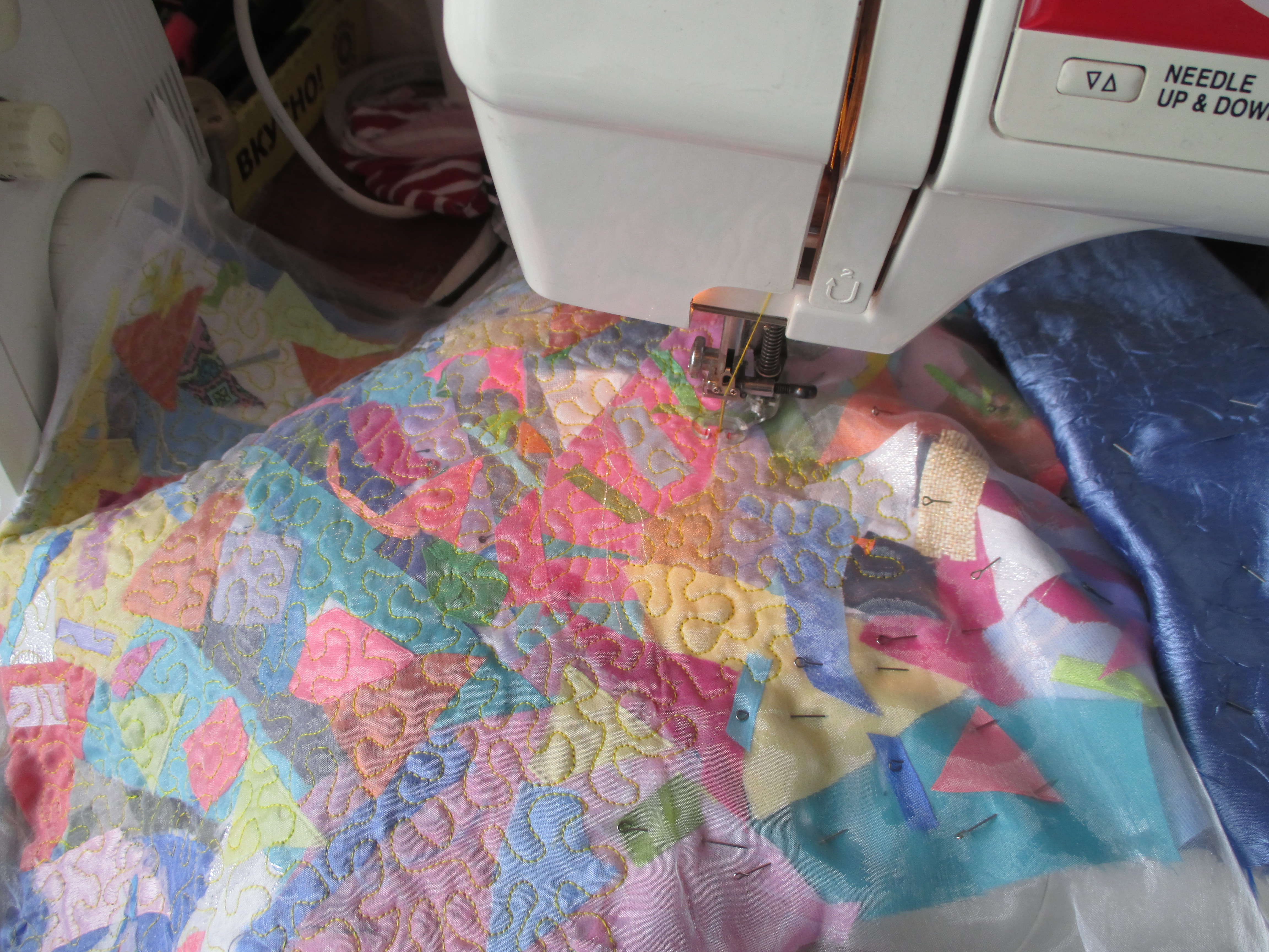 Был объявлен конкурс на пошив сумки-портфель- я решила поучаствовать. По условиям конкурса работа должна быть анонимной,но до организатора я не смогла достучатся может быть конкурс не состоится, поэтому я выгружаю свою работу сюда.Сумка у меня получилась "Веселенькая"А началось все с создания " Ткани" - это лоскутная пицца.Состоит из подкладочной ткани ,далее тонкий слой синтепона,затем клеевой флизелин, мелкие лоскутки. На них уложена аппликация из цветочков и небольших листиков и все это накрито органзой.