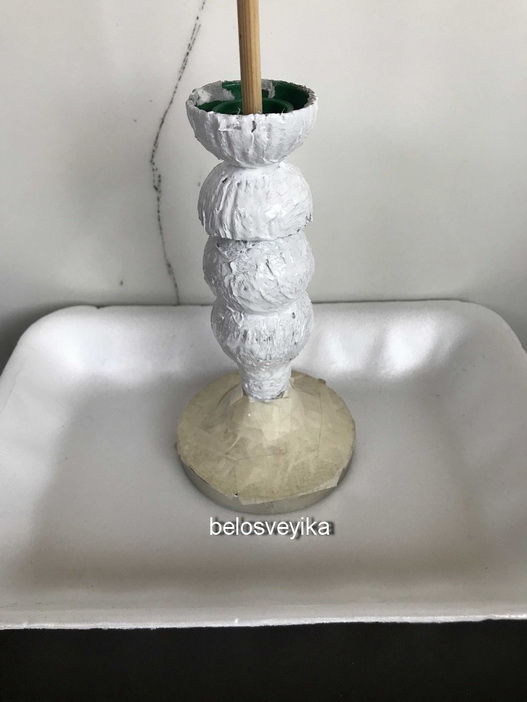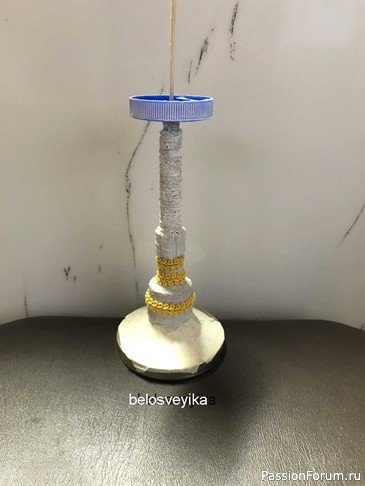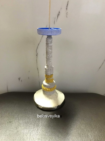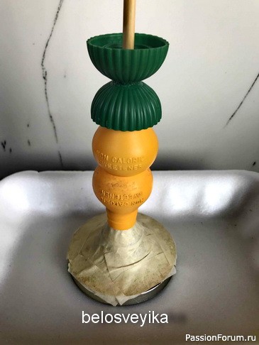 Для подставки использовала 2 грибка, это грибочки от сахаро заменителя.Низ это деталь от люстры,она уже красивая, не нуждается в окраске, поэтому заклеила бумажным скотчем
