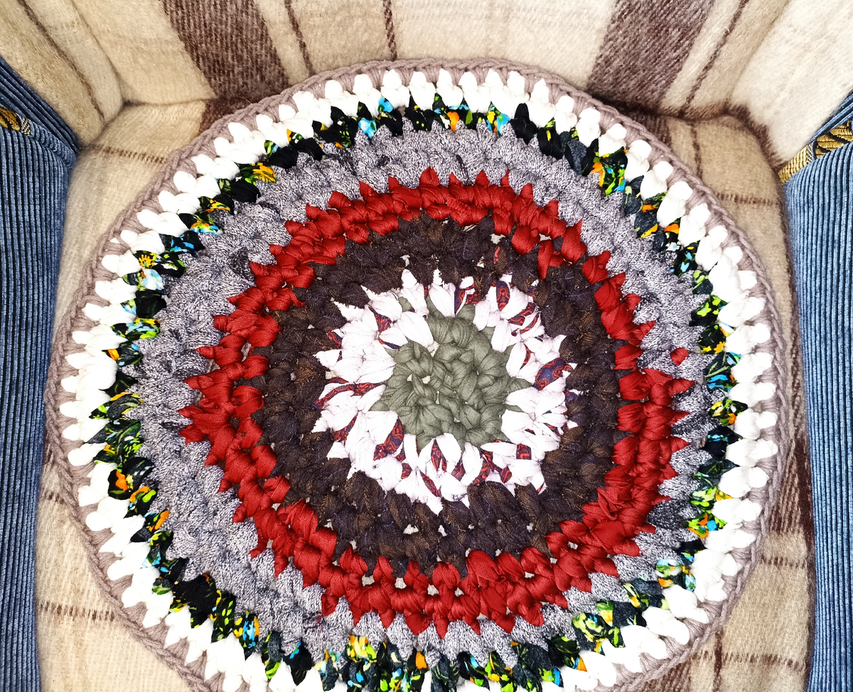 Ленту из ткани нарезала "на глаз", ширину не вымеряла, примерно по 4-5 см. Вязала крючком 9 мм. Коврик не стирала, потянула в разные стороны, край обвязала трикотажным серым шнуром 3 мм, с обратной стороны коврика ленточки спрятала, протянув их через столбики. Пожалела, что добавила ленту из шерстяной юбки (от центра третий кружок) - очень сыпется, лучше брать чистый трикотаж, флис. Всё вязала столбиками без накида.