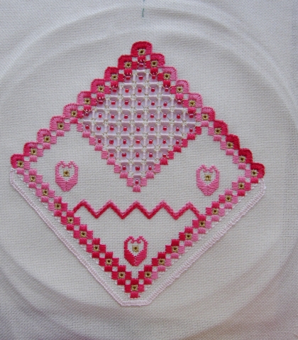 Диаметр пялец внутри 8 см. Попробовала из обрезка одну сторону маячка вышить, мне понравилось на них шить. Эта одна сторона (уж очень мне сеточка понравилась), на второй вышью лепесточки (ещё не знаю, как называются все элементы)