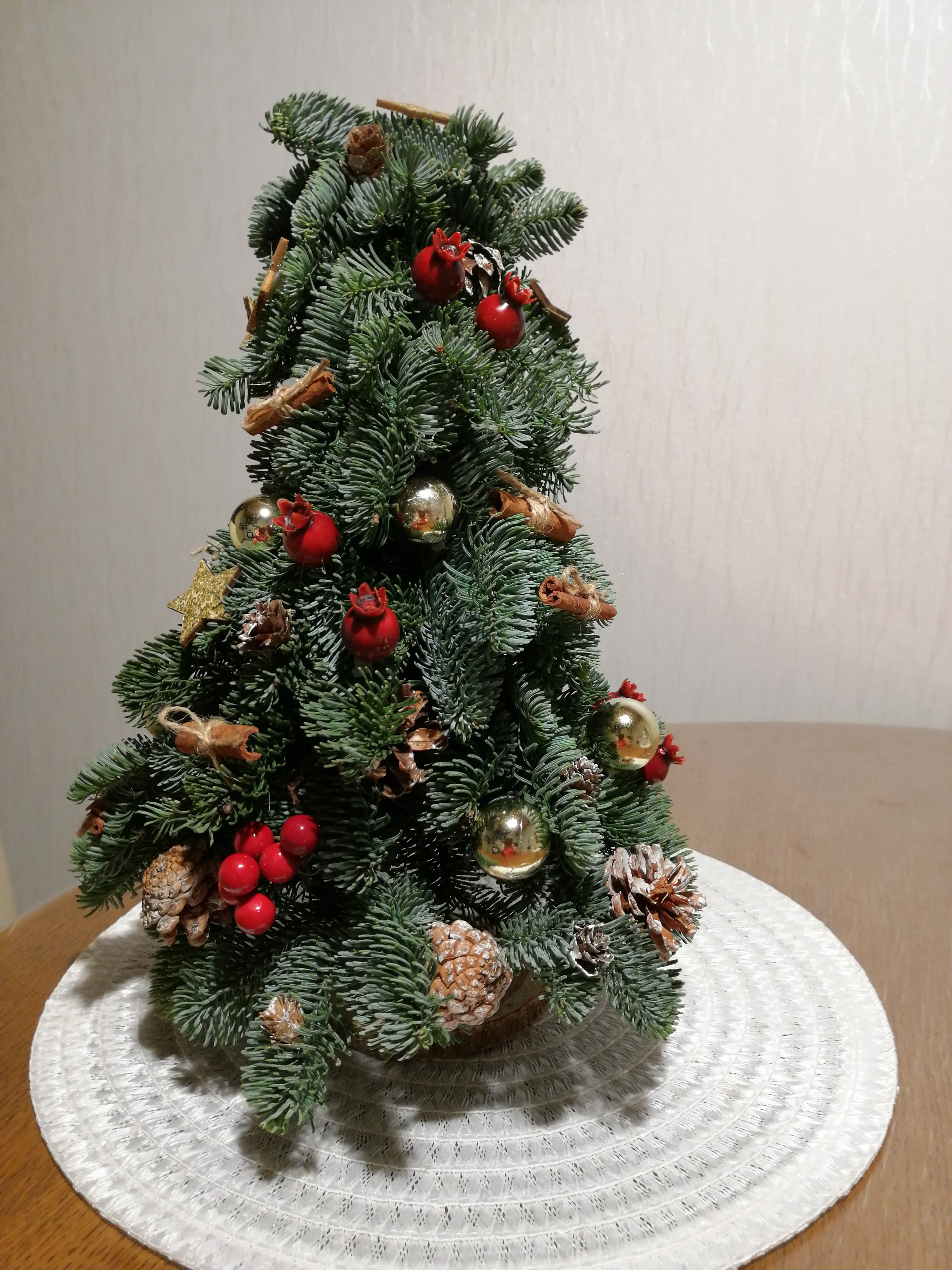 В основе использован спил дерева и палочка длиной с ёлочку. Пихта крепится на эту палочку.