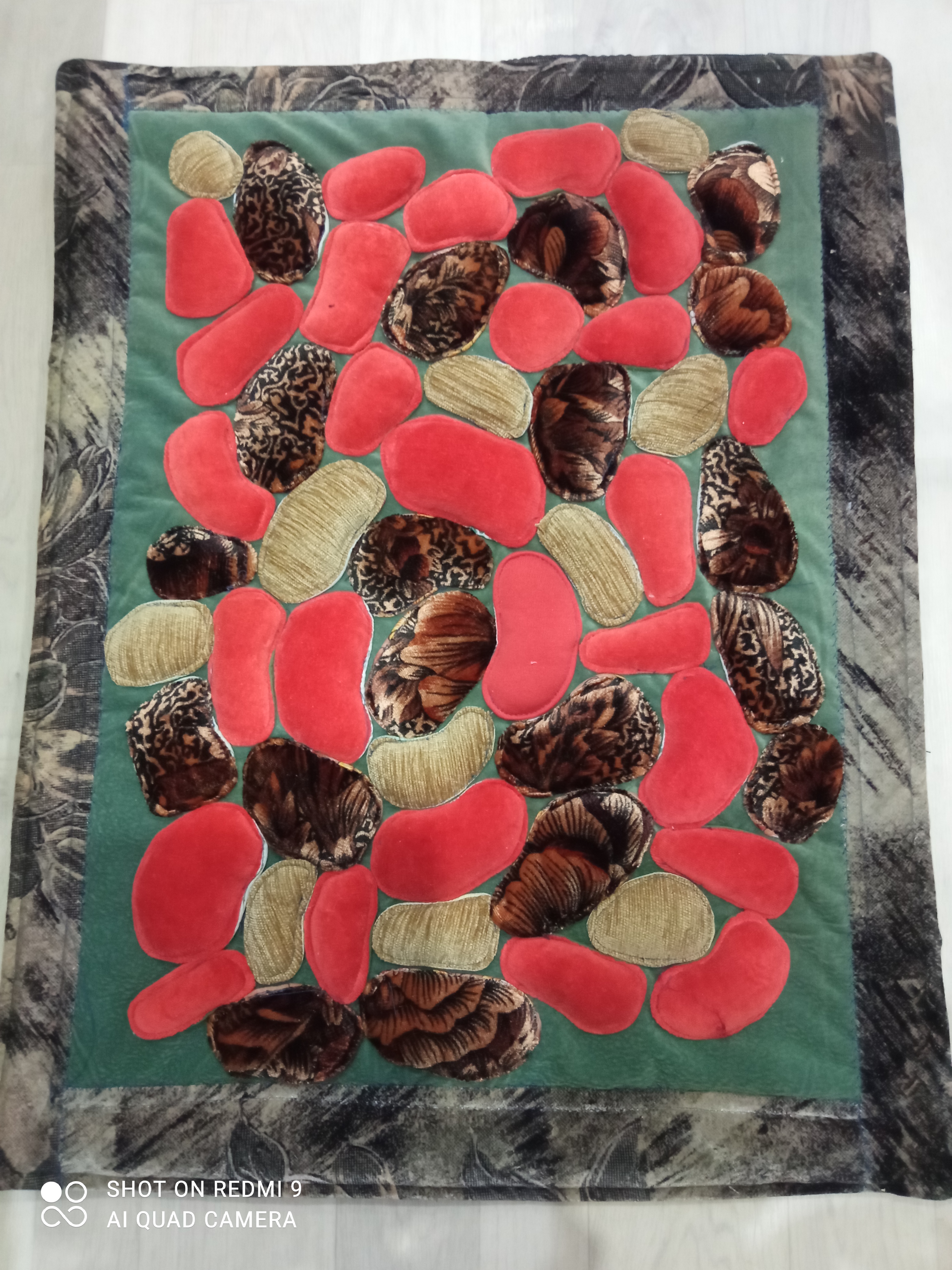 Приветствую всех рукодельниц и предлагаю посмотреть очередной коврик, который я сшила для туалетной комнаты размером 55х70 см. Насмотрелась в интернете темы сумки и коврики в технике "камушки" и загорелась этой идеей. "Камушки" я набила синтепоном, нашила на б/у мебельную ткань. Простегала холстопрошивным полотном (половой тряпкой) и коврик готов. Ходить по нему очень приятно. Он мягкий и веселенький. Именно такого эффекта я и добивалась. Приятного просмотра.