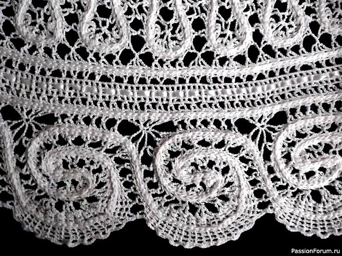 Брюггское кружево само по себе завораживает и вязать его не просто, помимо схемы, которую всё время необходимо поворачивать для правильного соединения, оно ещё и предполагает определенную длину элемента, которую ни уменьшить ни увеличить нельзя (это уже для мастериц класса экстра и то с трудом). Поэтому очень сложно бывает применить понравившуюся кайму именно для своего размера, она то шире чем необходимо, то уже. Мариночка, вам это удалось на славу! Очень гармонично и нежно смотрится ваша «Кружевная пена». У меня небольшой опыт по работе с таким кружевом есть. И вот как я подгоняла широкое кружево, делая его в верхней части поуже, если это кайма. В верхней прямой полосе посередине прокладывала крючком тамбурный шов нитью контрастного цвета (можно и в тон) при этом слегка стягивала. Тамбурный шов очень хорошо смотрится на брюггском кружеве, не перетягивает и им можно корректировать ширину. К тому же он делает кружево более рельефным. Вот, примерно так: