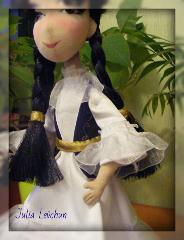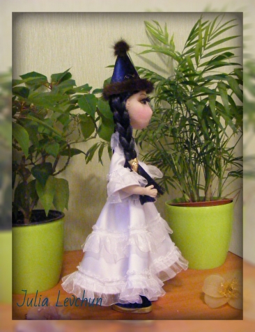 Описание: Рост 40 см. Каркасная. Ноги укреплены (основа габардин, обтяжка трикотаж). Самостоятельно стоит. Личико вышито, макияж – пастельный мелок. Реснички. Волосы- атласная лента. Заплетены в косички, украшены пайетками в виде листочков. Одежда : платье – атлас, украшен воланами-кружевами. Жилет – синий велюр, подкладка- атлас, золотая вышивка, пояс – золотая бейка. Сапоги – велюр, отделка – золотая бейка. Шапка-колпак – синий велюр, золотая вышивка. Отделка – натуральный мех.