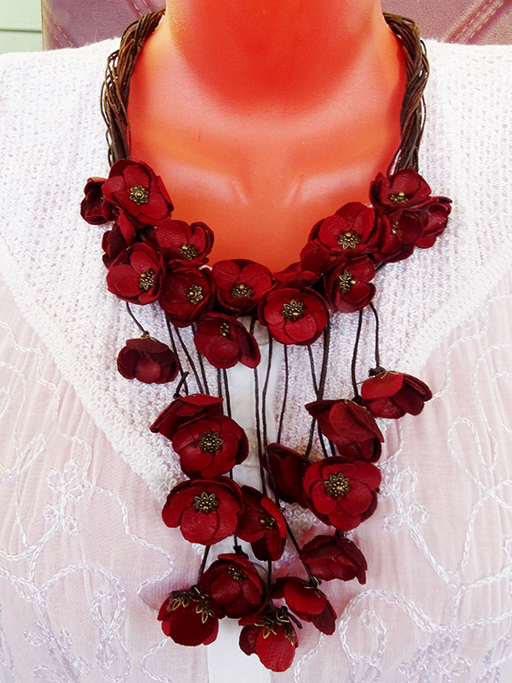 Очень красивые украшения! Мне понравилось колье из темно-бордовой кожи, королевский цвет. Люблю украшения из кожи. У меня есть брошь «Маки». Очень красиво смотрится на любых платьях, пиджаках, даже на пальто.