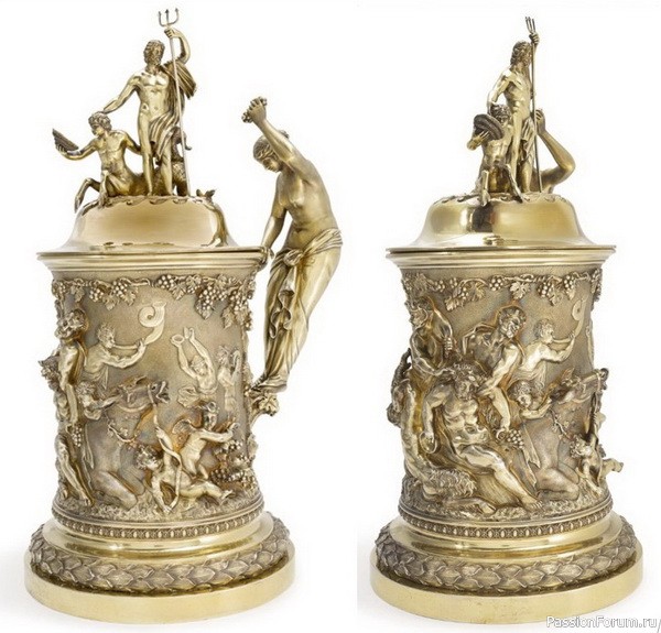 Большой кубок с крышкой из позолоченного серебра с вакхической сценой и ручкой в виде менады, увенчанный фигурой Нептуна, высота 40,7 см, Пол Сторр, 1830 г.