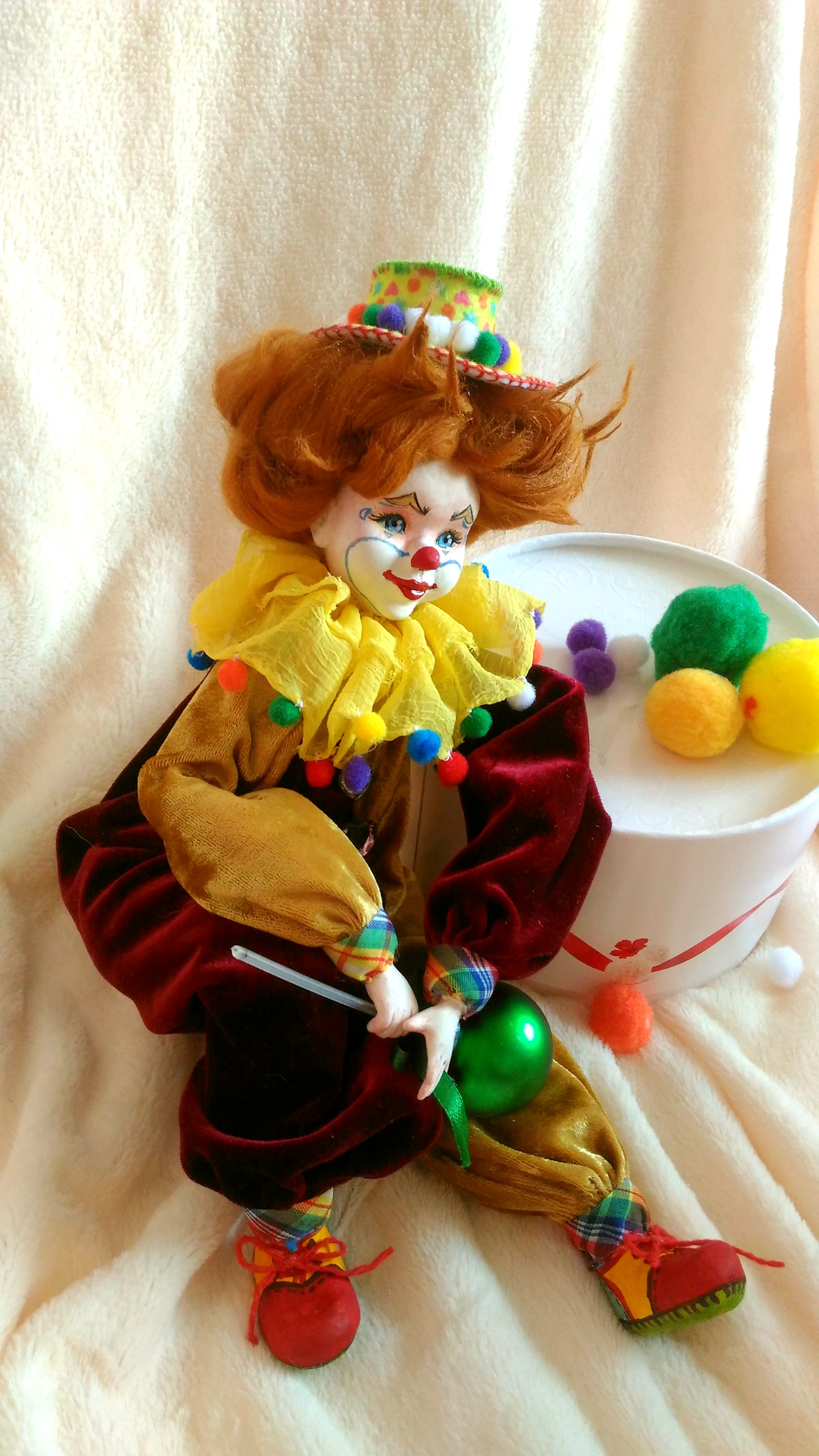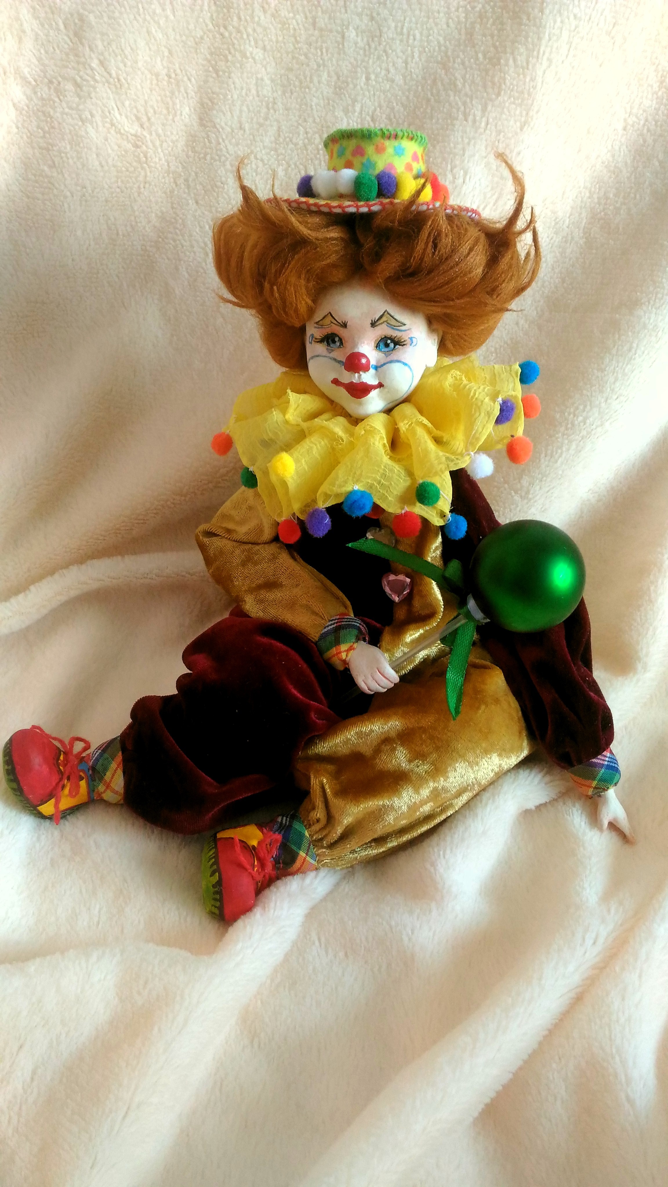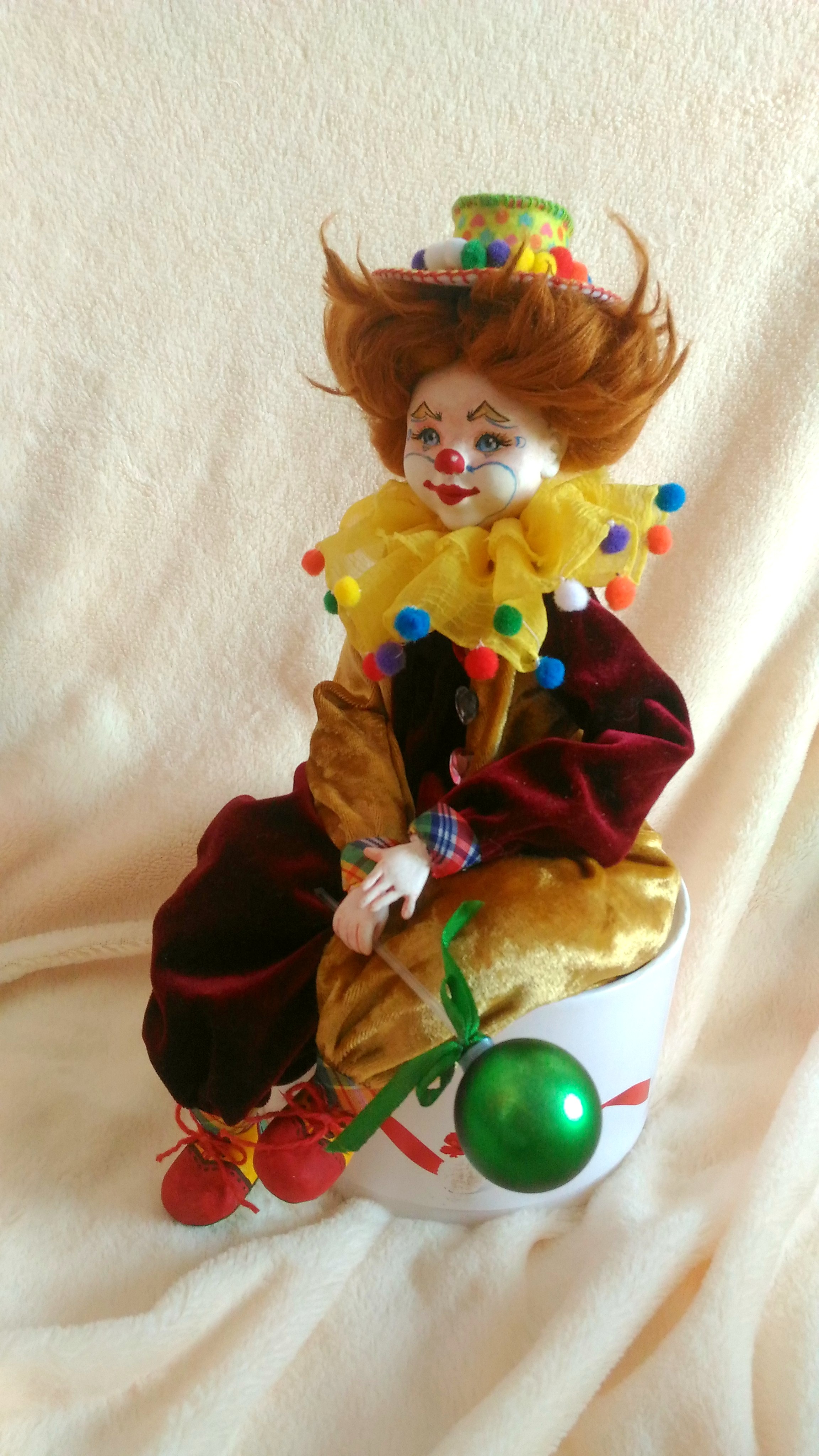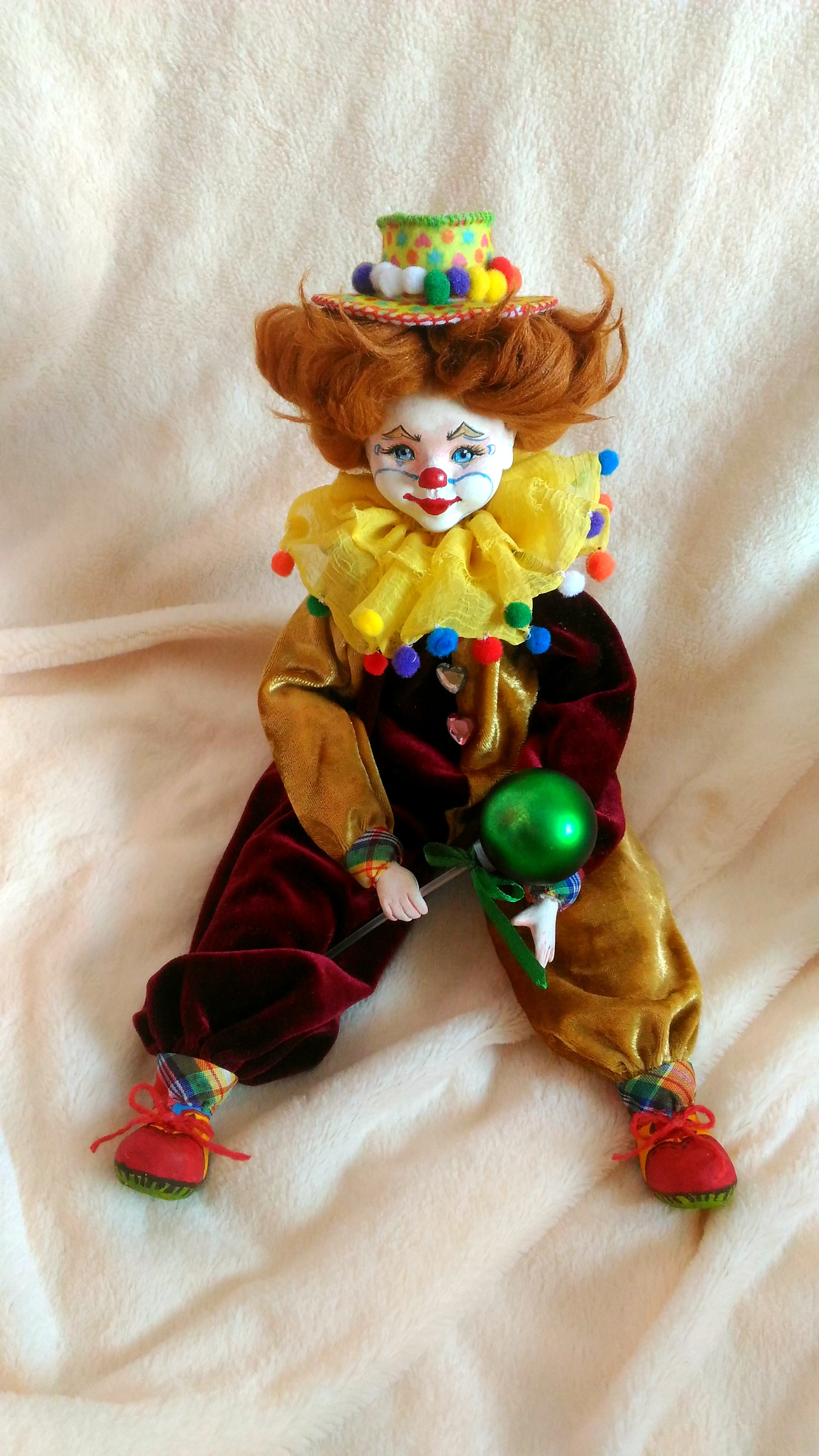 Кукла Рыжий Клоун. Рост куклы - 39 см. сидя - 25 см. Ручная работа, ручная лепка. Голова (не поворотная), руки и ботиночки из самозастывающей глины. Руки "болтушки", ноги на проволочном каркасе. Волосы из шерсти для валяния. Костюм из бархата. Шляпка из фетра не съёмная. Шарик на палочке в руку вставляется. Только сидит. Одежда не съёмная.