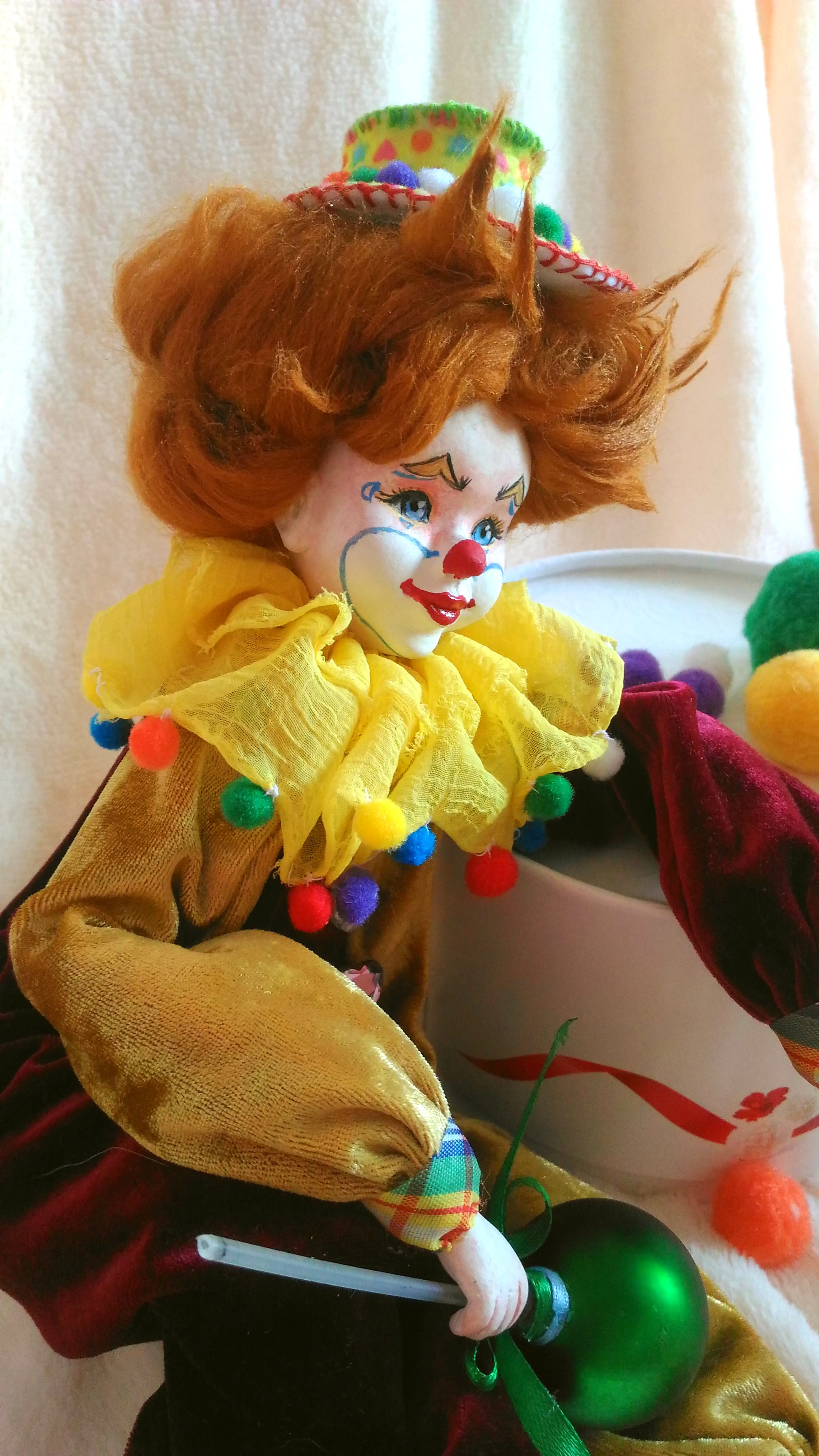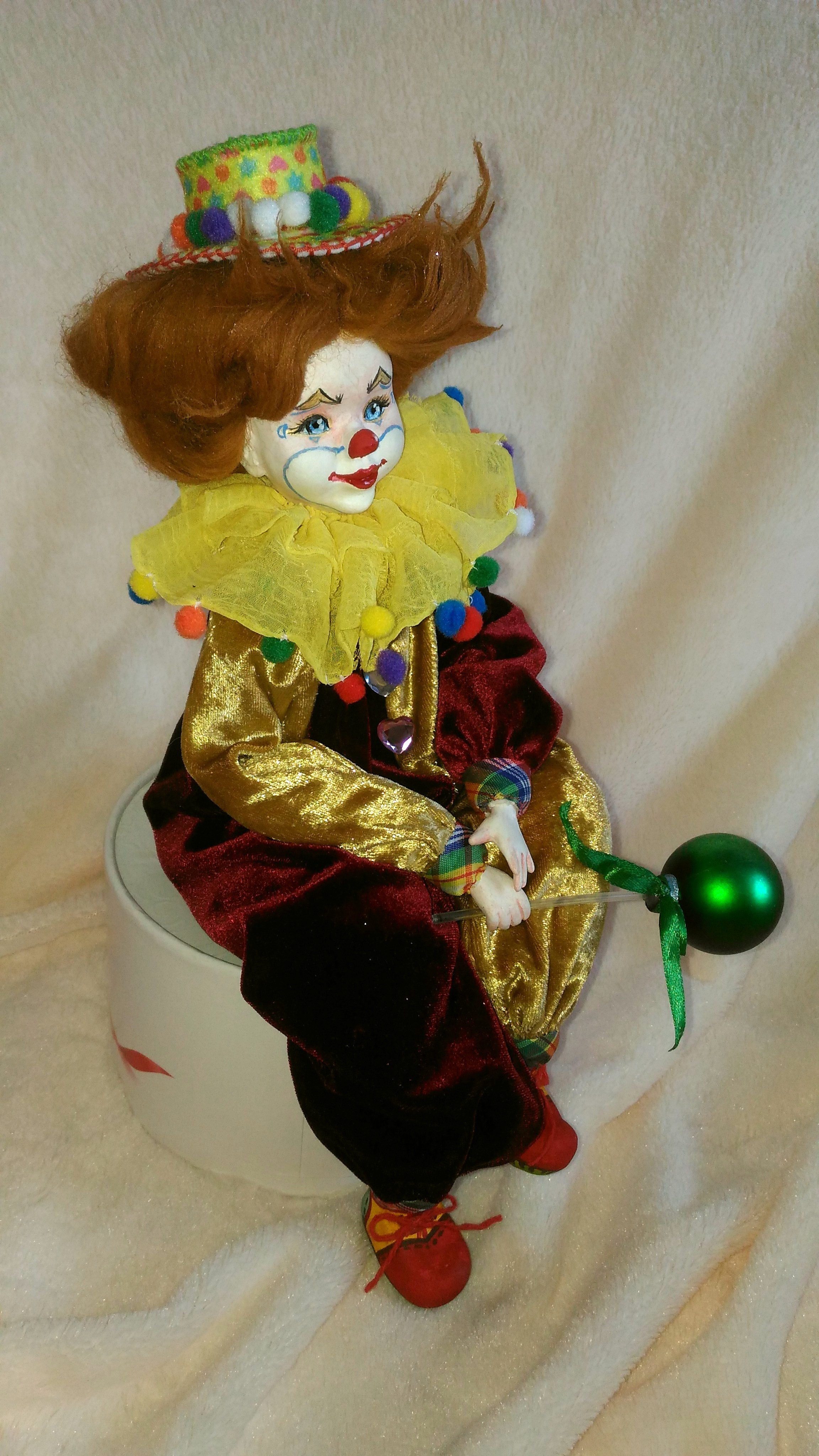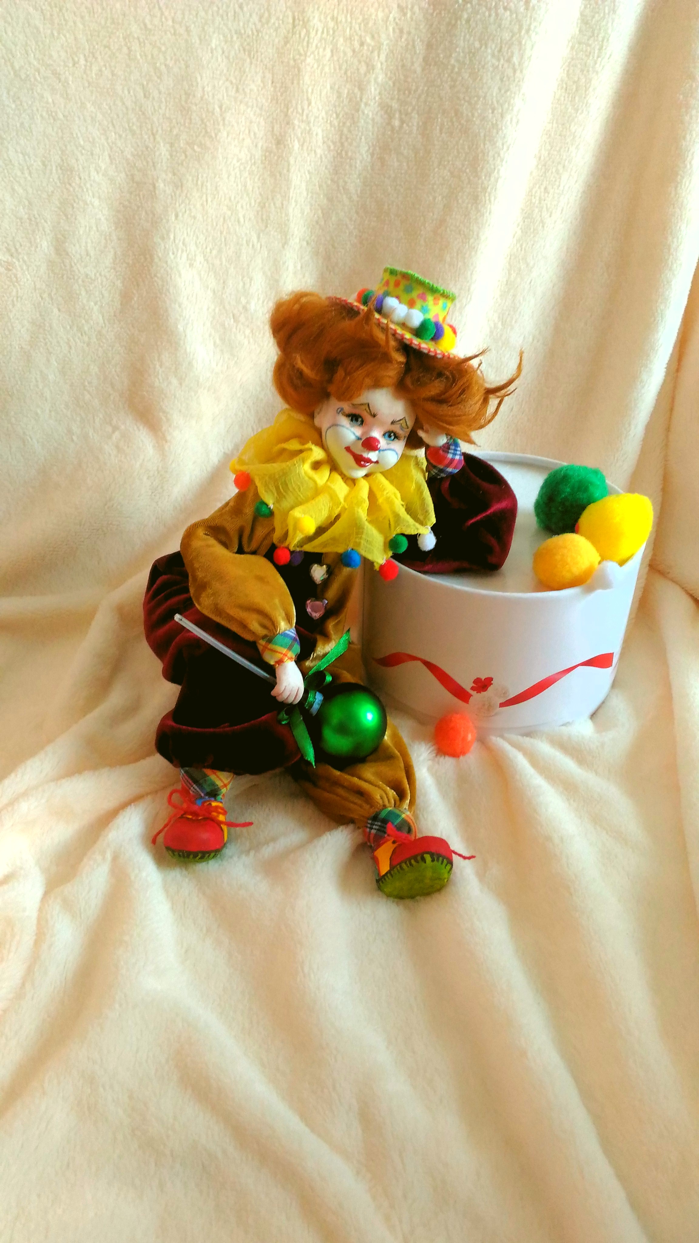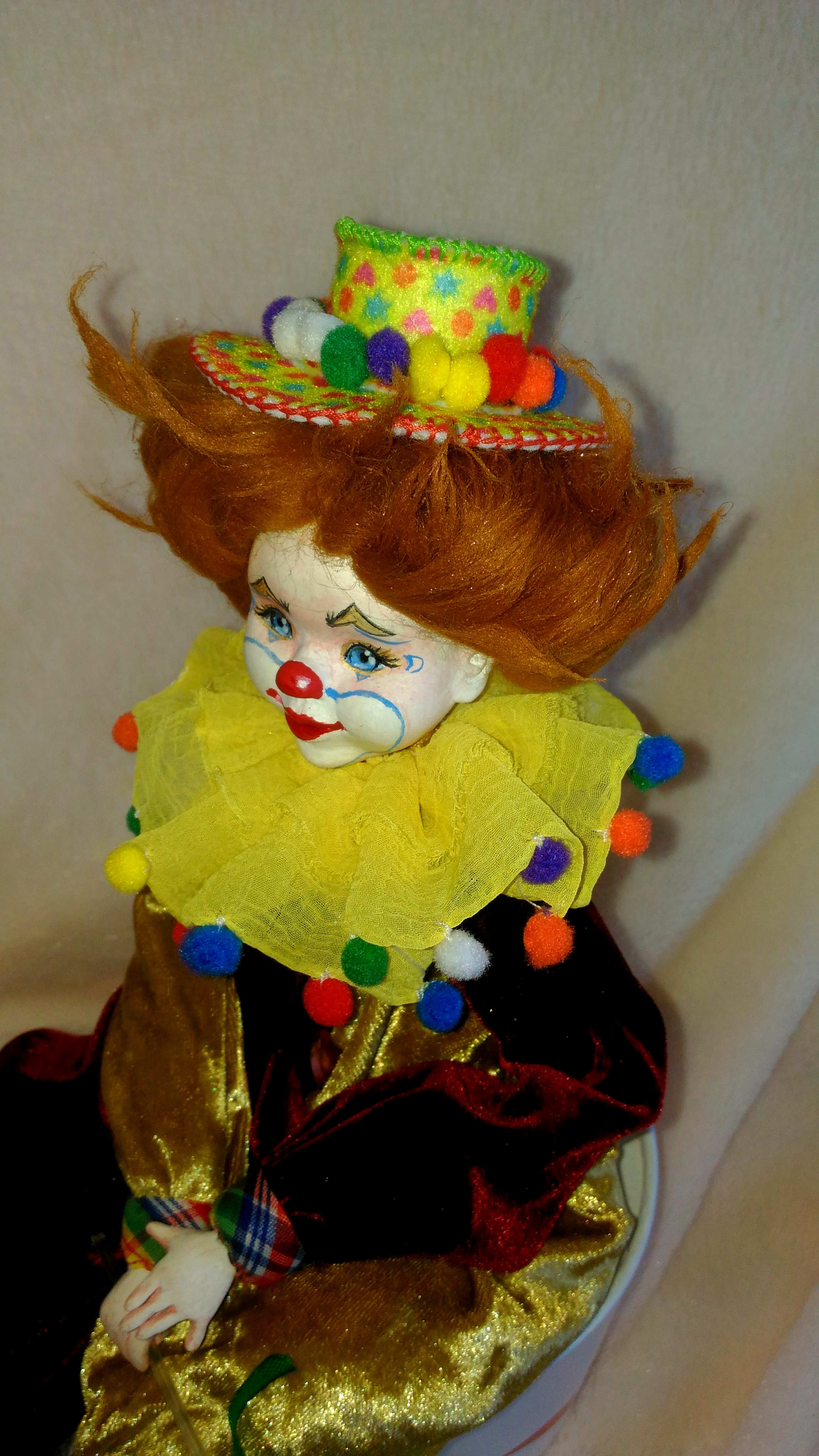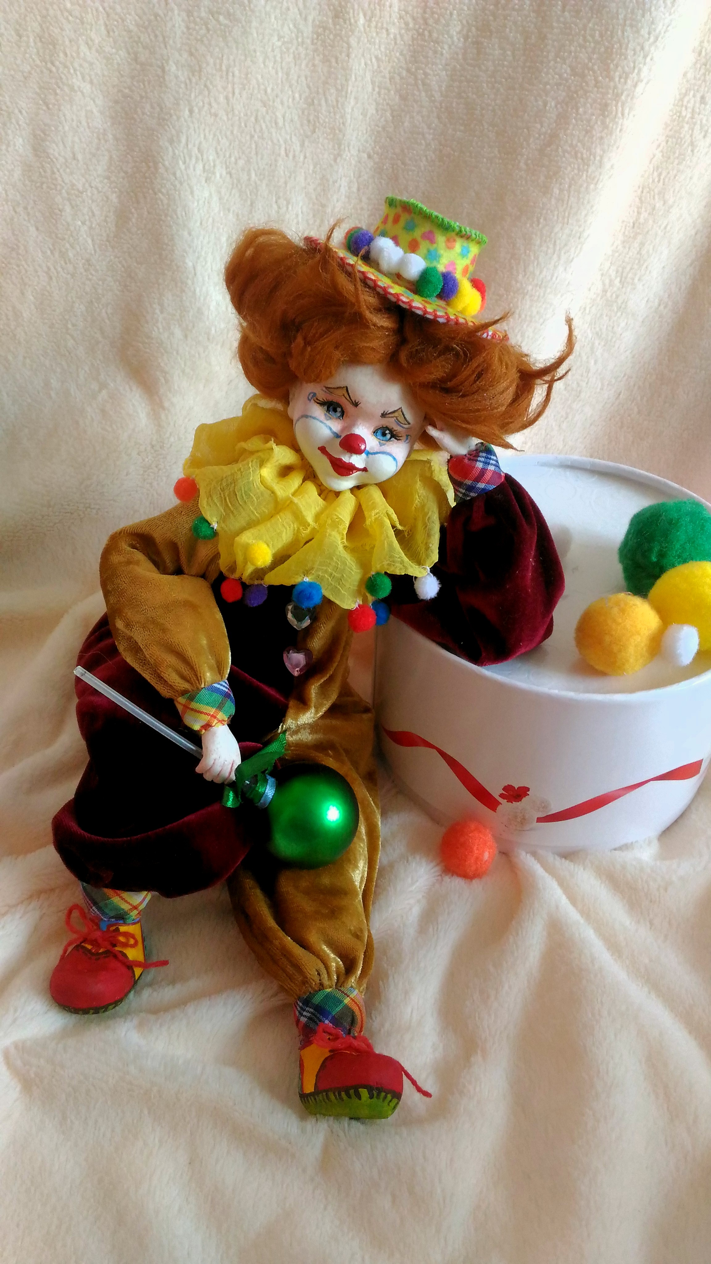 Кукла Рыжий Клоун. Рост куклы - 39 см. сидя - 25 см. Ручная работа, ручная лепка. Голова (не поворотная), руки и ботиночки из самозастывающей глины. Руки "болтушки", ноги на проволочном каркасе. Волосы из шерсти для валяния. Костюм из бархата. Шляпка из фетра не съёмная. Шарик на палочке в руку вставляется. Только сидит. Одежда не съёмная.