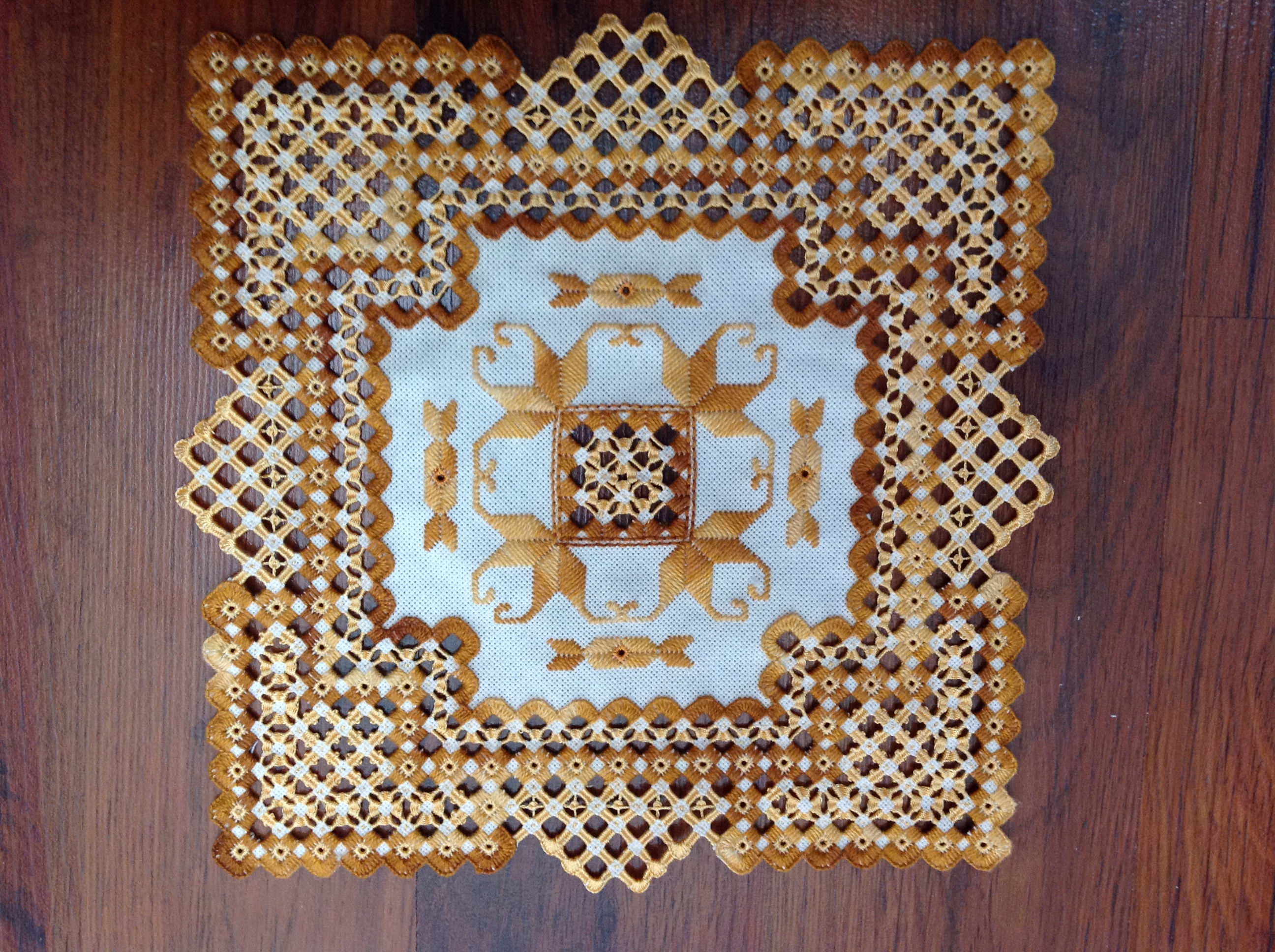 Очень нарядная и вкусная Карамель! Светлана, какая вы Молодец! Выполнена работа аккуратно — воздушные ажуры, ровные красивые бриды с пике, мальтийские кресты, паучки! А в центре переливаются карамельными оттенками гладьевые элементы! Браво!