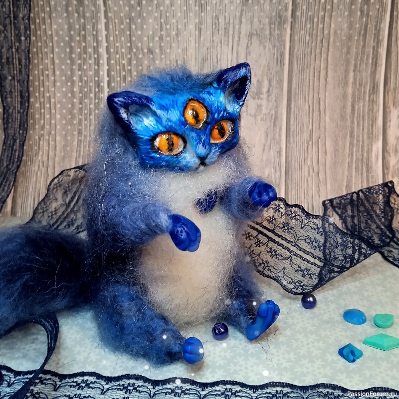 Рост 10 см, глаза слабо светятся в темноте, выполнен в технике сухое валяние. Наполнитель синтепух. Натуральная шерсть, лапки, мордочка и сердце из полимерной глины. Ручная роспись. Уникальный и неповторимый.