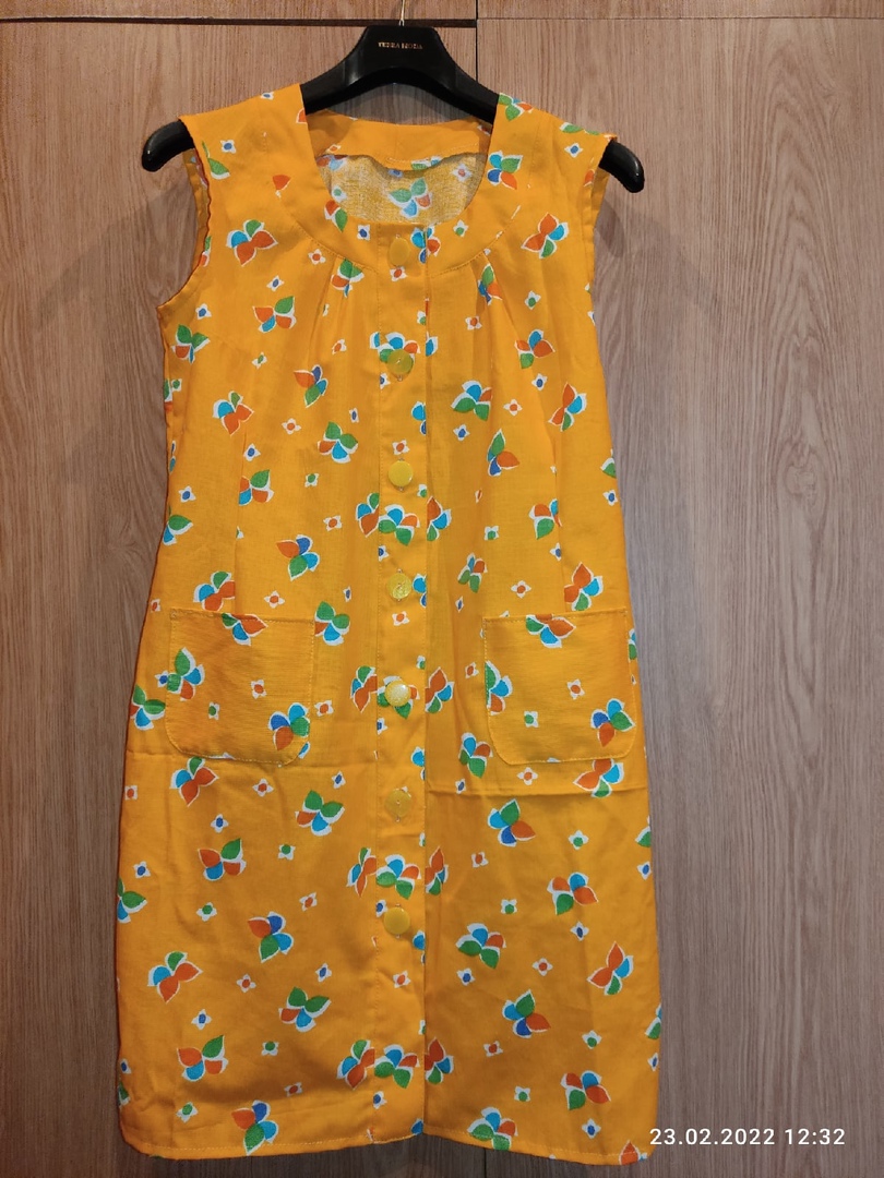 Вытачку на шее я перенесла в горизонтальное положение в обтачку, нагрудная вытачка на полочке распределилась над грудью. Сарафан вышел великолепный! Пуговки разные, мне так захотелось.