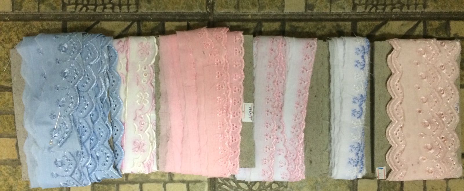Я бы например хотела подробнее узнать по тесьму хлопковую, если есть, не на резинке.Мне нужна ширина, фото на контрастном фоне, чтоб был виден узор.Метраж, цена за метр или за весь кусок.