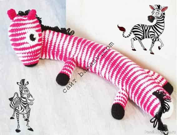 Зебра домашняя Большая игрушка зебра в готовом виде составляет 85 см в длину. Связана зебра акриловыми нитями, которые называют «искусственной шерстью». Большая игрушка зебра связана крючком своими руками Розовая красавица Приятная и мягкая пряжа не вызывает аллергии, что очень полезно для малышей. Зебра, как большая игрушка или в виде подушки, понравится детям. Особенно, если она связанна крючком любимыми руками. Материалы для вязания: пряжа King Cole Big Value Chunky (100% акрил), 100 г/152 м; по 3 мотка белого (A), черного (C) и ярко-розового (B) цветов; наполнитель; гобеленовая игла; маркер; крючок № 6. Большая игрушка с плотностью вязания: 8 рядов x 12 петель = квадрат со стороной 10 см. Описание вязания Грива зебры и хвост связаны серой нитью длинными петлями.