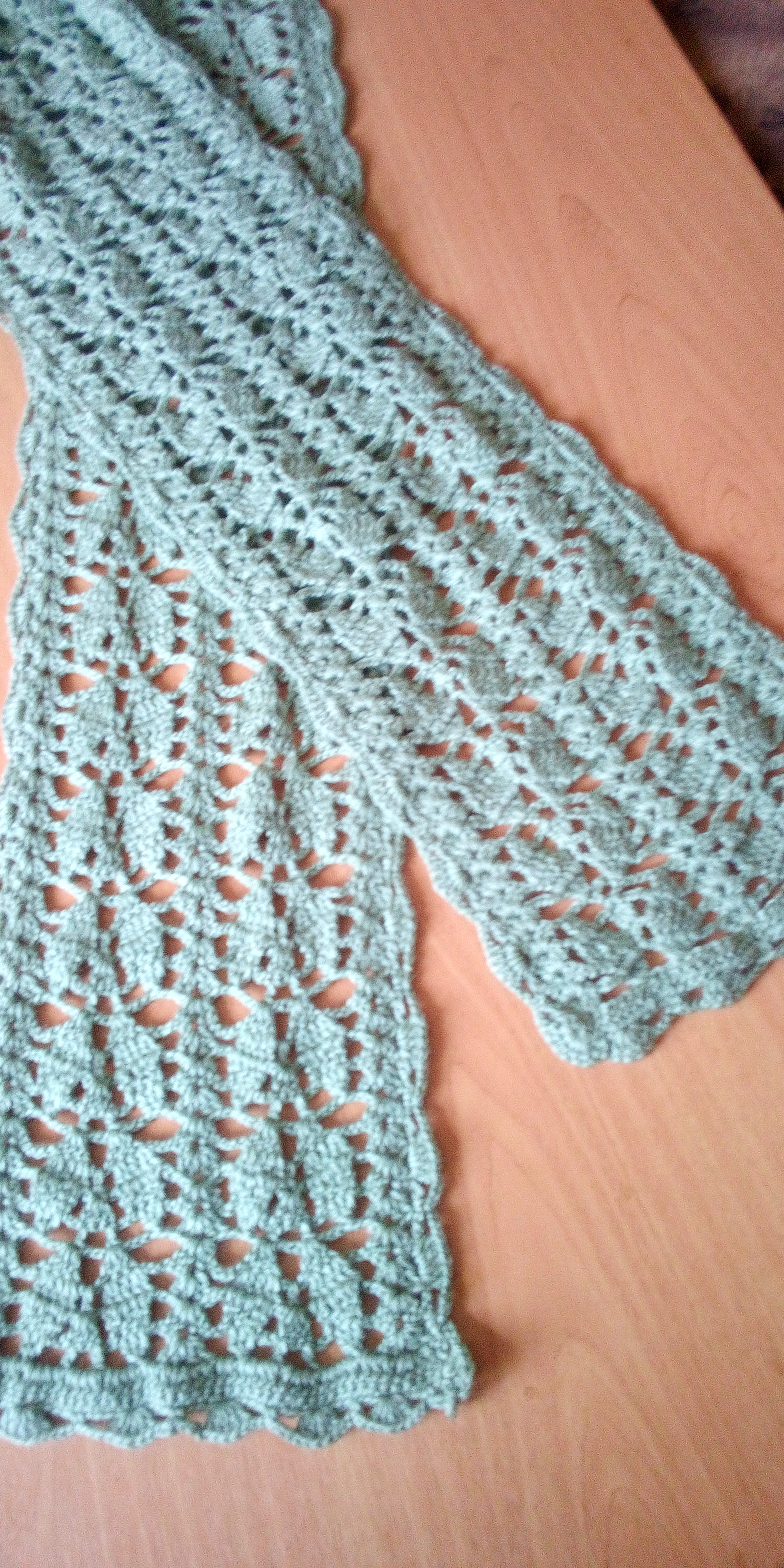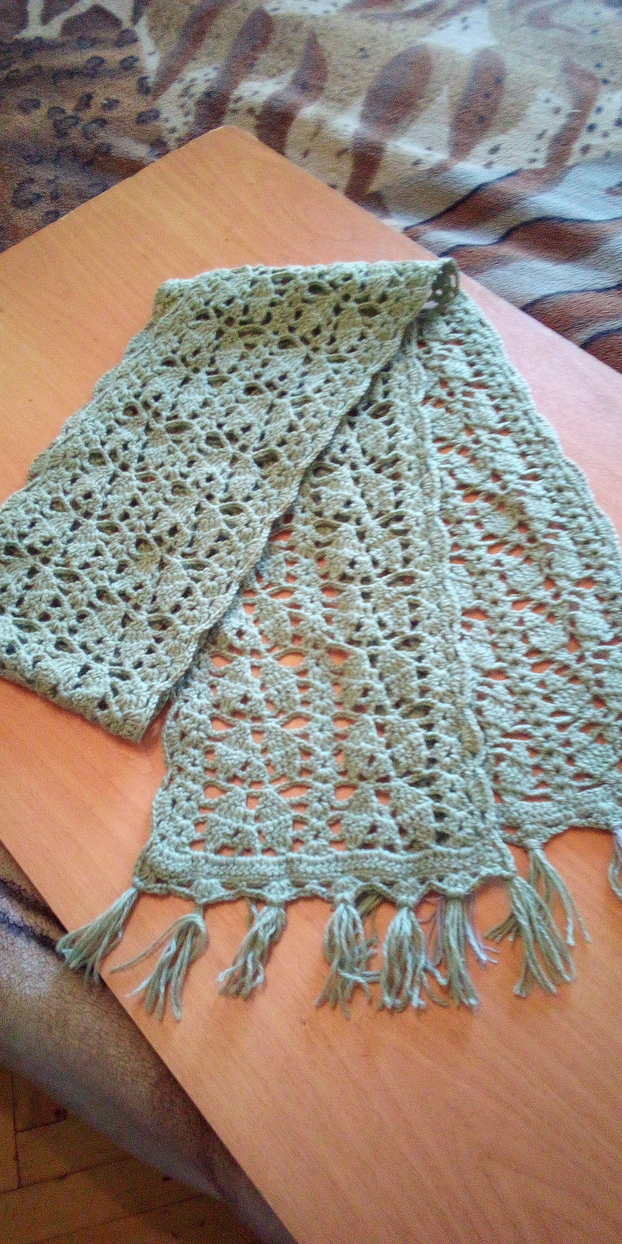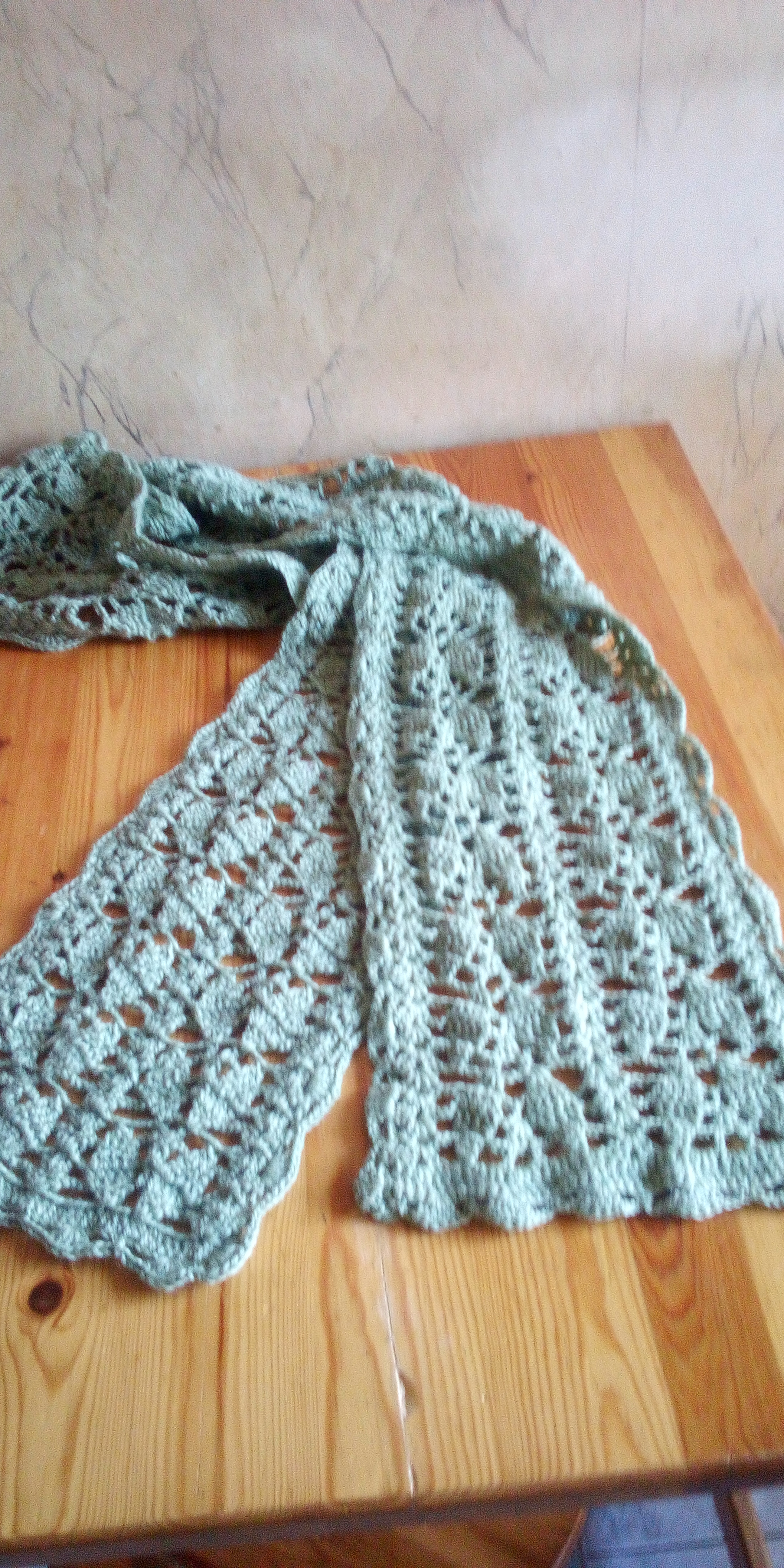 Шарф связан из пряжи акрил+ шерсть.Цвет св.зеленый(серо-зеленый).Размер 210х22 см.Работа готова к продаже.Цена 2000 руб.Доставка:самовывоз из Люберец или отправка почтой после предоплаты.