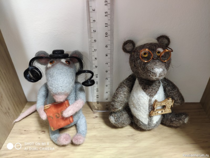 А это поступил недавно смешной заказ - валяные мишка и крыс, оба высотой 10 см, мужского пола и с национальным колоритом.