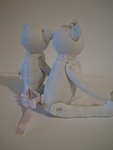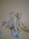 | 10. Теперь беремся за лапы. Важно! нитка должна быть прочная, чтобы не порвалась при затягивании! Иголку вставляем в шов на шее, вытаскиваем на туловище там, где будет верхняя лапа, протыкаем лапу в намеченном месте, цепляем бусинку, обратно в ту же дырочку в лапе, а потом в ту же дырочку в туловище, так же и с другой стороны. Шьем несколько раз туда-сюда, постепенно затягиваем, потом иголку вытаскиваем под лапой, обматываем вокруг ниток между лапой и туловищем раз пять (чтоб красиво и для прочности), вытаскиваем под другой лапой, делаем то же самое, закрепляем под шеей. Важно хорошо затянуть, чтобы лапы не болтались - а то они будут сами опускаться под собственной тяжестью или зверь при попытке посадить его будет заваливаться носом вперед. А другой мишка у меня с пуговицами, разница в том, что пуговицу лучше пришить к лапе парой стежков заранее, а то держать и пуговицу, и лапу, и мишку не очень удобно , а так все то же самое. Важно! когда шьем нижние лапы, надо сначала воткнуть иголку в туловище, оставить хвостик (чтобы затягивать, просто верхние лапы так не разбалтываются, как нижние), затем с другой стороны пришить лапу, потом с той, где "хвостик" оставляли, и так несколько раз, нитку вывести к "хвостику", затянуть, связать их крепко, потом уже обмотать и спрятать концы  11. Намечаем, где будут глаза. Иголку втыкаем сзади в шов на шее, выводим под бусинку, потом опять в ткань, выводим под бусинку другого глаза, повторяем, немножко затягиваем, чтобы глазки втопились, и закрепляем в шейном шве 2. Вышиваем нос. Я вышивала мулине, можно носик чуть-чуть наметить карандашом, я делаю на глаз 13. Берем ленточку подходящего цвета (сначала примеряем на мишку), оплавляем зажигалкой края (чтобы не распускалось), и пришиваем аккуратно сзади, чтобы замаскировать шейный шов. 14. Дальше украшаем как нам хочется - я повязала "мужчине" галстук из белой ленточки, а "девушке" повесила кружевную ленточку |