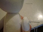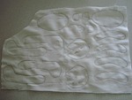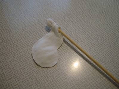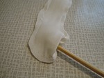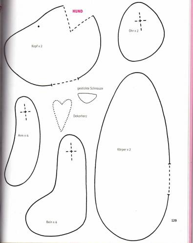 4. Вырезаем, оставляем примерно полсантиметра, на круглых узких частях (верх и низ лап) можно поменьше. С головой сложнее - я думала, что можно уши вшить в эти замечательные вытачки на голове, ан нет, не получилось пришлось делать так: я обвела вытачку с обратной стороны (я же обводила выкройку только с одной стороны, поэтому с обратной стороны ничего нет). Вырезала, наметала руками и прошила. . Выворачиваем. Для этого делаем руками небольшую "ямку" и туда засовываем палочку, не сильно усердствуя, если ткань сыпучая, можно ненароком ее прорвать | |