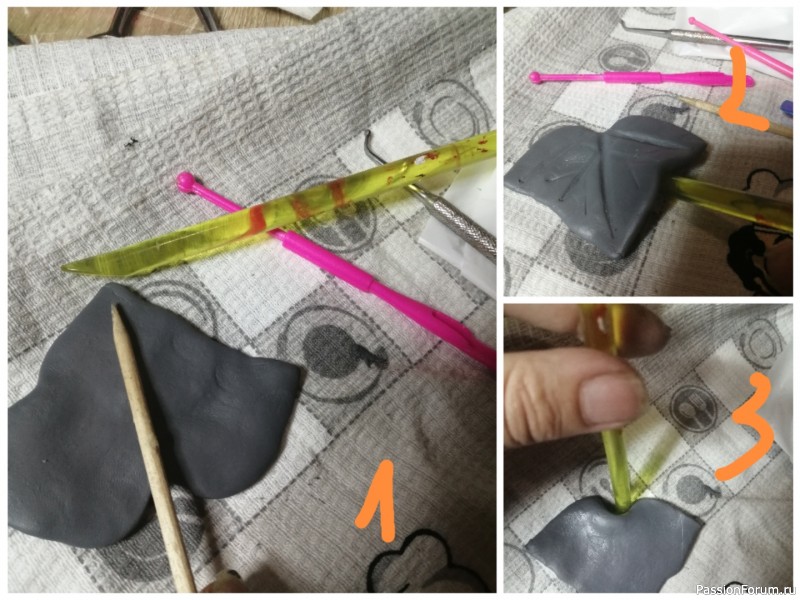 Теперь делаем рельеф листика на плоскости, прожилки,при помощи какой нибудь палочки, у меня для маникюра. Затем надо сделать углубление от куда растет черенок, тоже при помощи палочки, но пошире, у меня кисть. Помогая при этом руками.