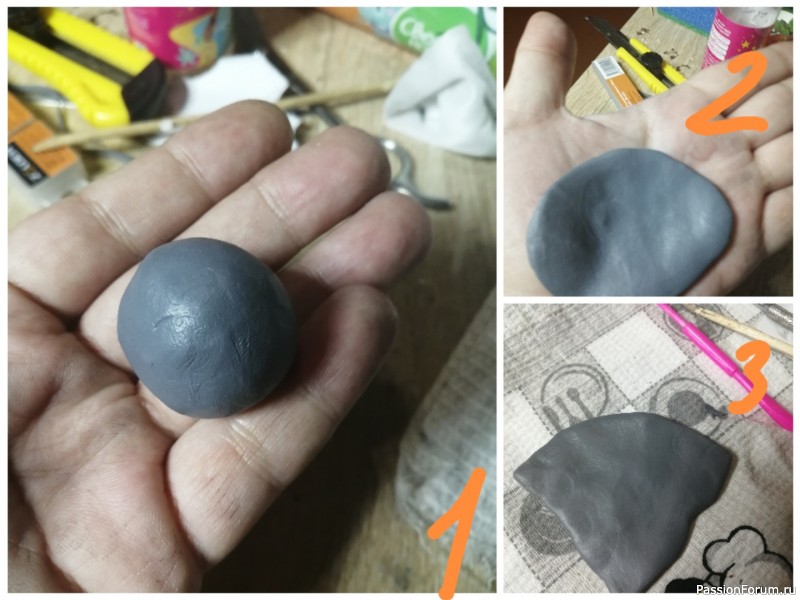 Переходим к лепке листиков, у меня их три. Скатываем шарик фото 1, сплющиваем в блинчик фото 2, Придаем форму треугольника с вогнутыми двумя сторонами фото 3. Сразу хочу отметить, листики не делаем тонкими, истонченными, это не реалистичный букет)) а скорее всего имитация барельефа.