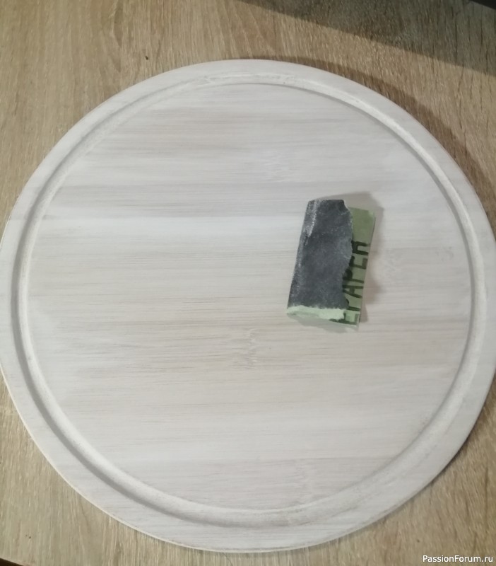 Через трафарет наносим рисунок. У меня, к сожалению, внизу получились подтеки, я дала слегка высохнуть убрала лишнее зубочисткой. А уже после полной просушки, прошлось мелкозернистой наждачной бумагой. Как видите рисунок я не стала наносить на всю досочку.