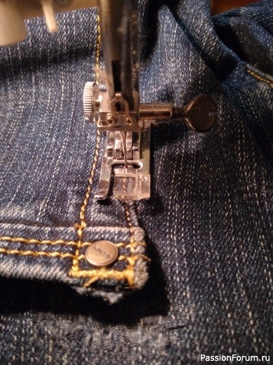 После этого пришиваем карман на место. Строчку притачивания выполняем той же ниткой, что и штопку, прокладываем ее максимально близко к декоративной отстрочке кармана, тогда она будет практически незаметна.