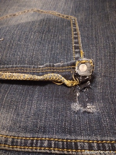 Случилась необходимость починить пострадавшие джинсы. Они новые и любимые, но порвались на самых видных и неудобных местах, притом, что в самых проблемных местах (между штанинами у шаговых швов, внизу штанин у подгибки, на коленях даже ткань еще не потрелась). Оказался вырван гак говорят «с мясом» задний левый карман, и точно так же вырвана металлическая фурнитура с правого заднего кармана.