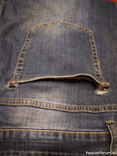 Я в подобных случаях сажу заплатку на прозрачный обувной клей " Момент". Даю строчку на пару миллиметров от края порыва, чтобы закрепить заплату, потом пришиваю карман на место по старому отделочному шву. Строчка в цвет джинсов практически не заметна, ткань не деформируется, не стягивается, карман остается на месте, заплатка благодаря клею не осыпается.