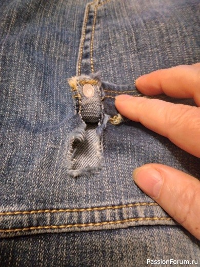 По идее, такие сквозные дефекты ткани штопаются. Но здесь ситуация осложнилась тем, что разрывы ткани в местах крепления кармана. Джинсовая ткань и без того толстая, а в этих местах она еще и в несколько сложений, плюс металлические заклепки. Заштопать такие дефекты обычным способом невозможно. А подойти иглой достаточно близко ни одна лапка не позволит.