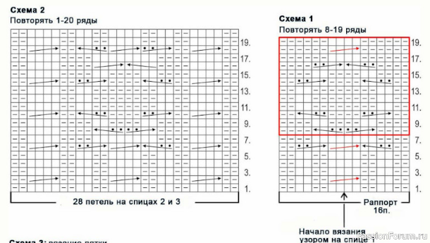 Провязать таким образом 2-12 ряды по схемам, далее на спицах 2 и 3 продолжить вязание 13-го схемы 2, выполнить далее 14- 20 ряды и далее повторять 1-20 ряды до конца вязания носка. На спицах 1 и 4 продолжить вязание раппорта из 16-ти петель с 13-го ряда схемы, а остальные петли — чулочной вязкой. Выполнить 13-19 ряды, потом повторить 8-19 ряды 7 раз, потом 8-11