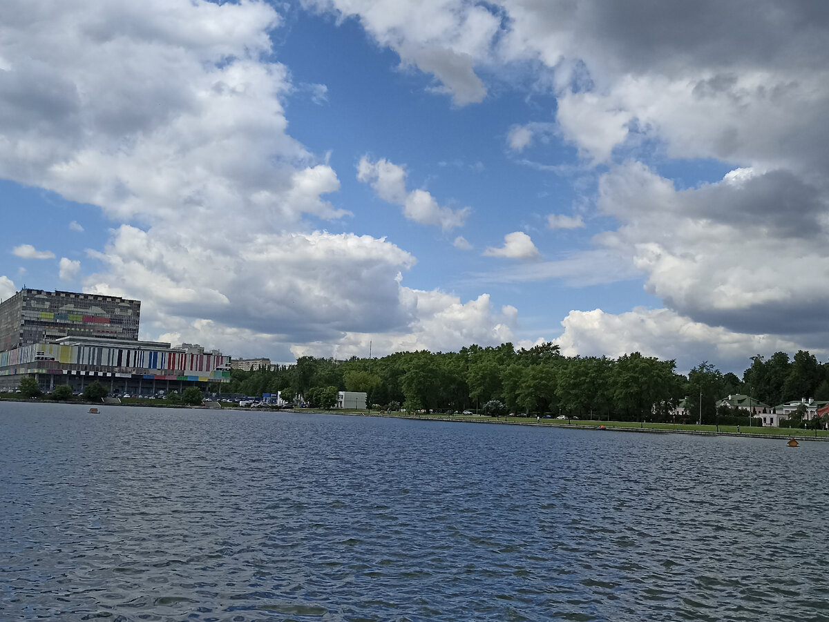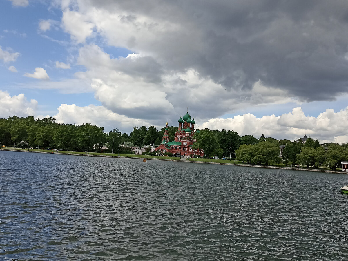 Вдруг вижу - через дорогу озеро красивое. А это Останкинский пруд с уточками и лодочками. Ой, красиво, не зря столько шла. Вдалеке Храм виднеется. Прогулялась.