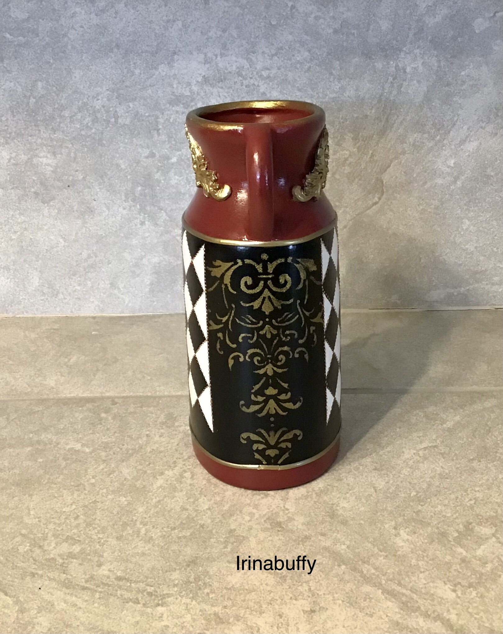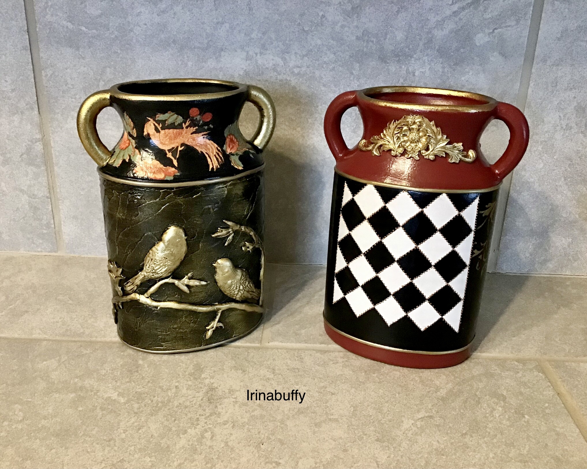 Всем добрый вечер!Снова я экспериментирую.На двух одинаковых вазах решила поиграть декором.Первая с птицами- Использовала молды, создала текстуру шпатлевкой,золочение акрилом и восками,верх и низ отделила витражной лентой.На верхней части фрагменты салфетки и подрисовка. Вторая ваза с ромбами.Сделала разметку при помощи линейки и сантиметра,раскрасила чёрной и белой красками, золотым контуром прорисовала стыки ромбов. Дополнила отливками, трафаретом, витражной лентой.Обе работы покрыты глянцевым лаком.Всем Здоровья и благополучия!