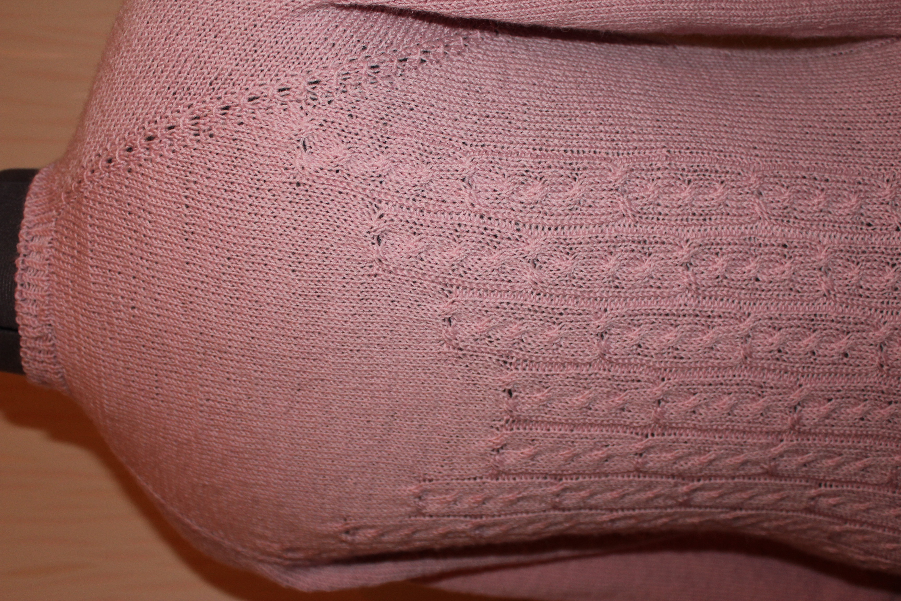 Регланная линия из пяти петель, узор "замочек" (спасибо нашей форумчанке Ларисе из г.Сумы). Араны не очень рельефные, так как пряжа довольно тонкая.