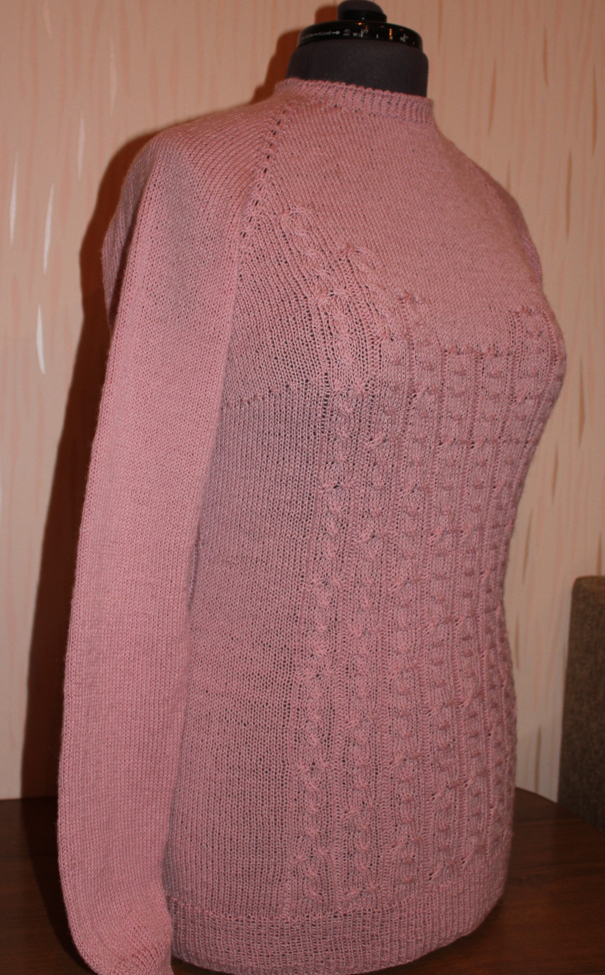 Боковой шов на тушке и рукавах имитируется дорожкой из двух изнаночных петель, вдоль которой я производила убавки и прибавки для лучшей посадки.