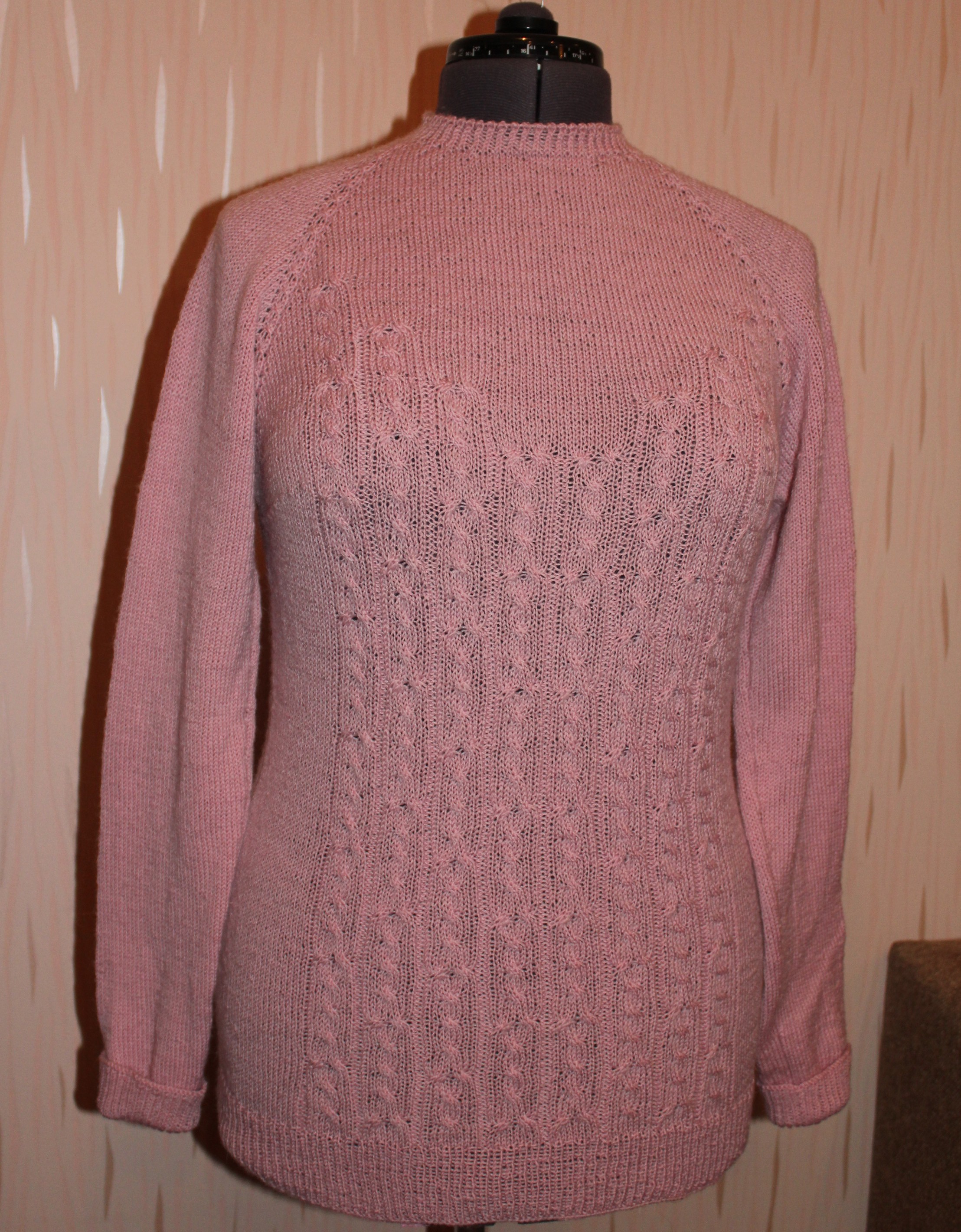 Кассандра - так называется пряжа. Марка Vita Германия, 100% шерсть ластер, метраж 400 м в 100 г. Она лежала в моих закромах в количестве 500 г с 2014 года. Я предпринимала несколько попыток связать из нее что-либо. Вначале вязала в одну нить - показалось, что слишком тонко. Потом вязала в две нити - получилось толсто и грубо. Хотела платье, но пряжи не хватило бы. Решила вязать джемпер. Хотелось, чтобы было тепленько, без дырочек. Поэтому от ажура пришлось отказаться, хотя ажур на этой пряже смотрелся бы неплохо. Пряжа очень качественная, гладкая, слегка пружинит. Цвет пряжи - один из моих любимых, холодный розовый. Жаль было бы ее испортить. В конечном итоге получилось то, что хотелось - тонкий, но теплый джемперок приятного цвета, мягкий, не колючий.