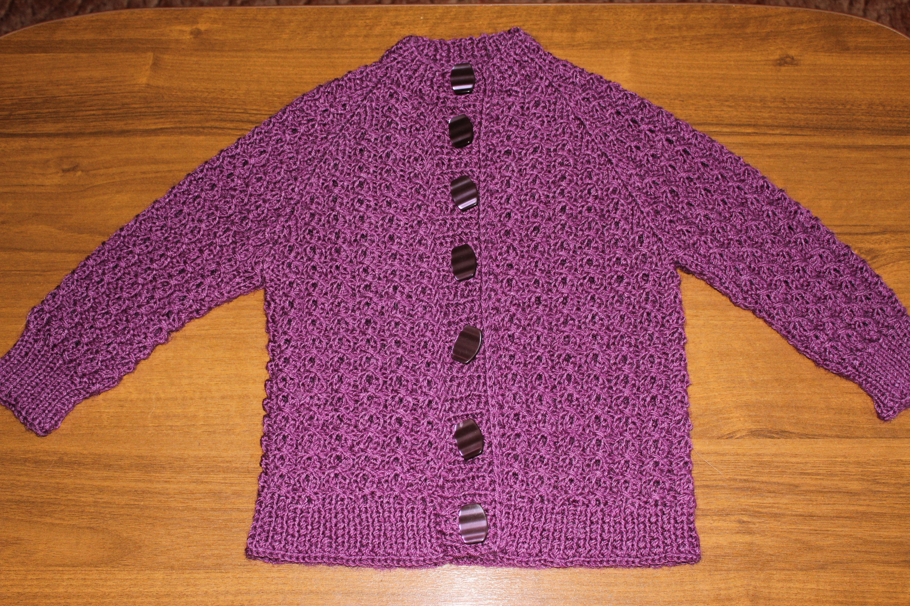 Попутно покажу кофточку, связанную для внучки. Здесь пряжа б/у, 100% шерсть, также реглан сверху с ростком. Узор "замочек". Пуговицы велики для небольшой кофточки, но зато не расстегиваются самопроизвольно.