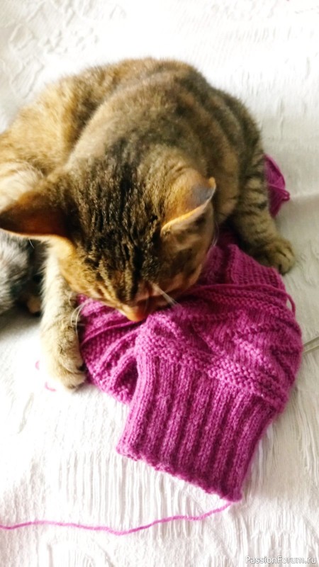 Помощница действительно подгоняет, если оставить ряд недовязанным в пределах доступных для котейки - принесет в зубах в любое место квартиры, конечно распустит часть по дороге. Если вещь крупная, принесет моточек)))