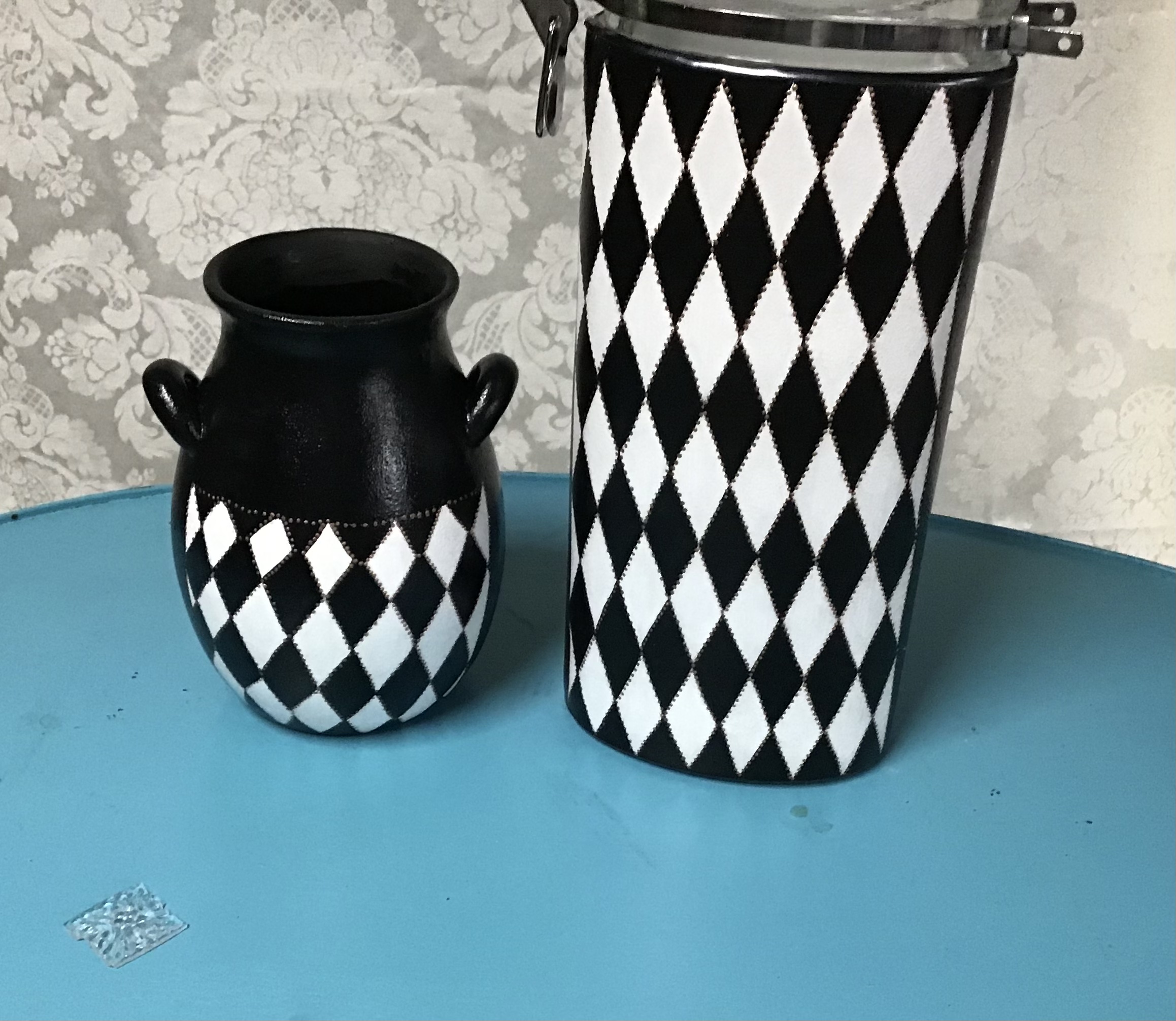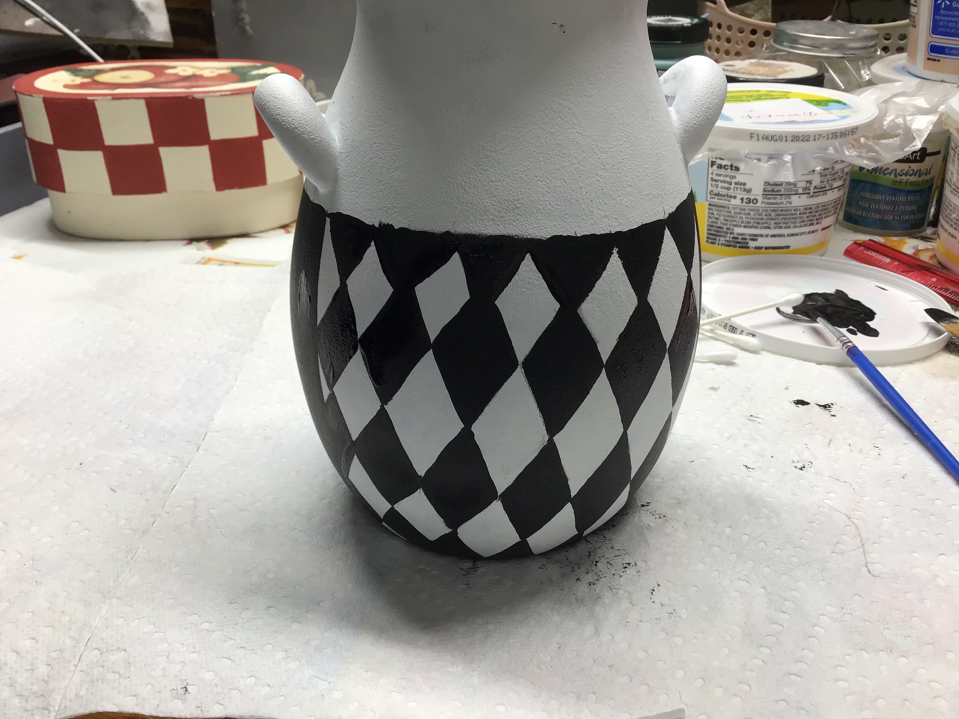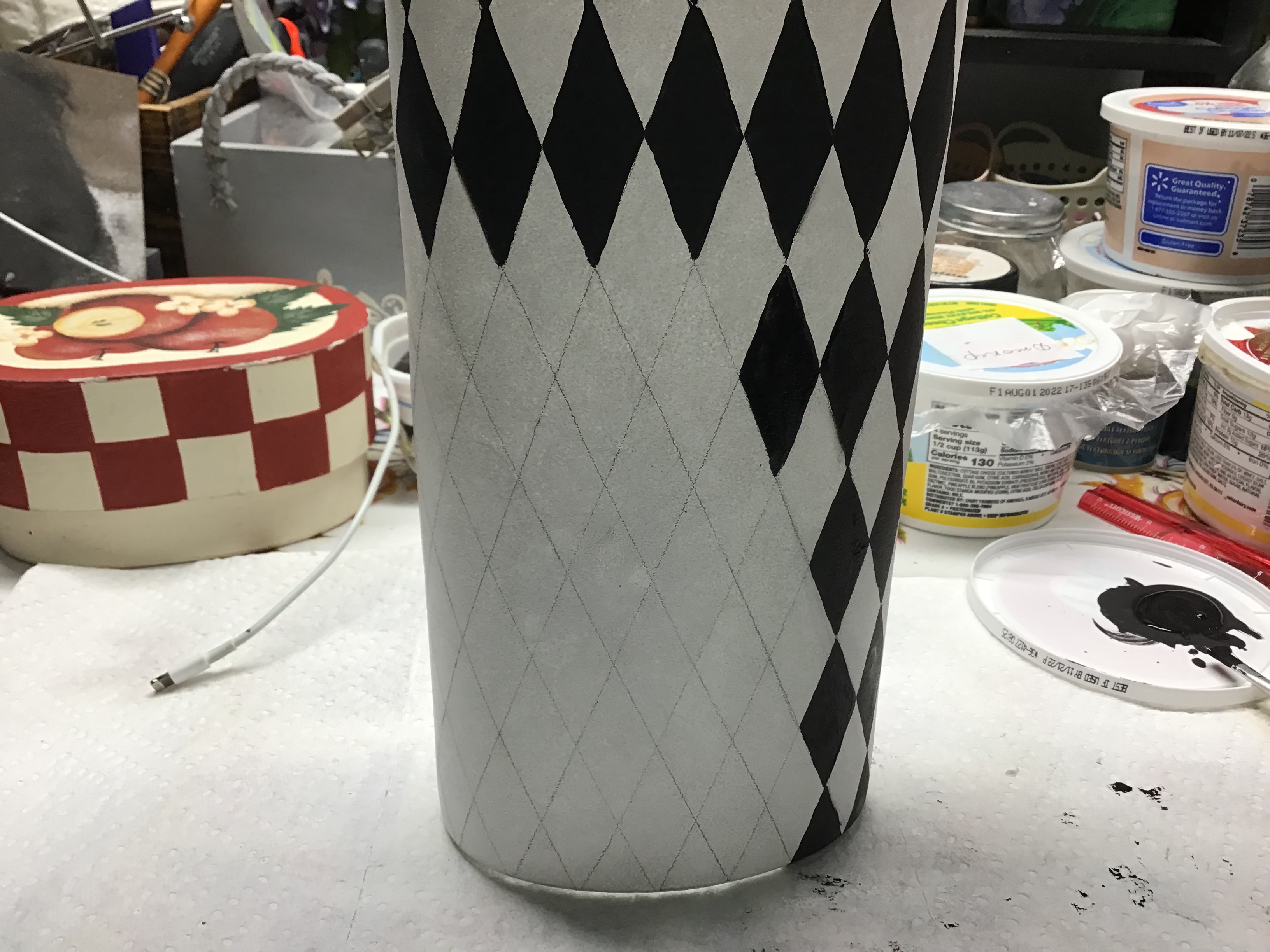 Начинаем закрашивать чёрной краской ромбики.Здесь видно,что верхний ряд получился некрасивый,буду переделывать .Решила сосредоточиться на спагетнице.