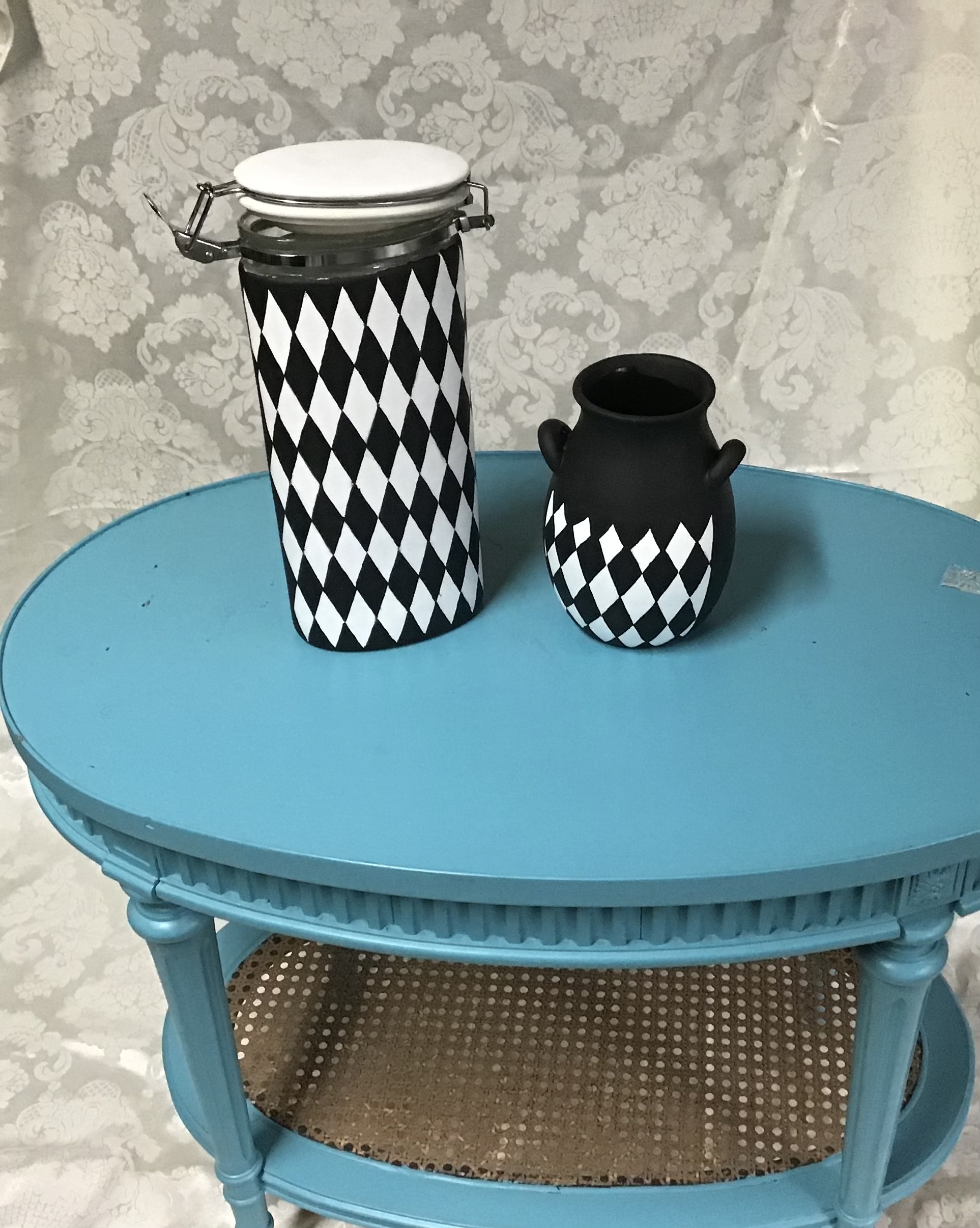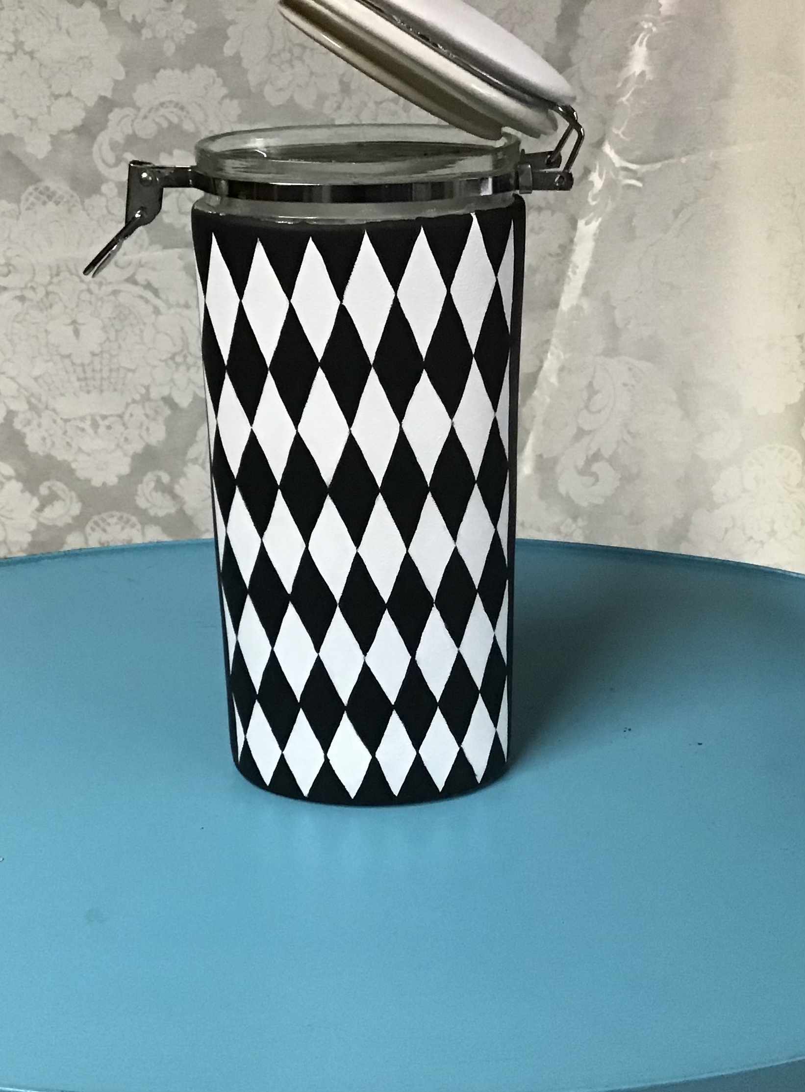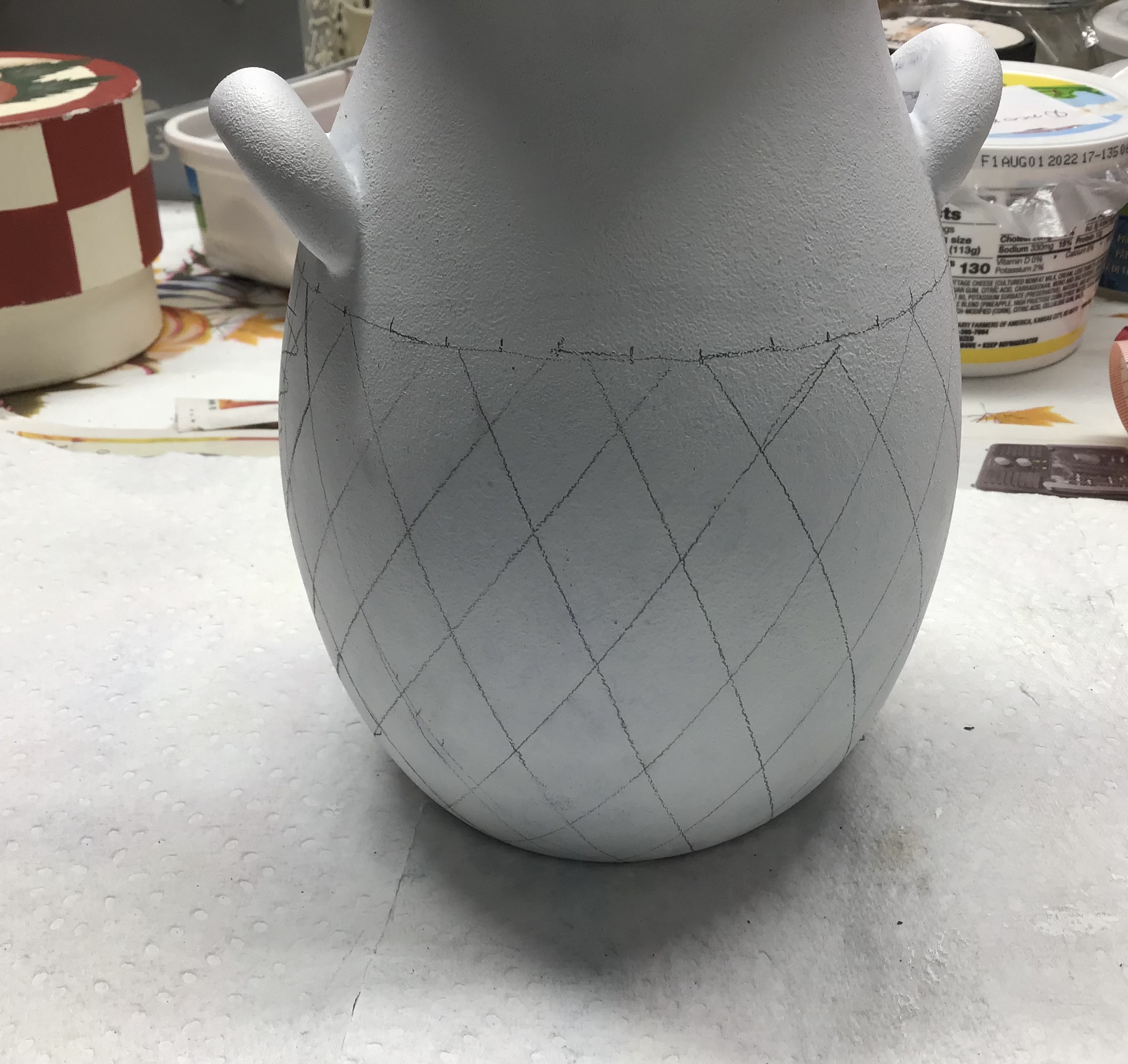 Начинаем закрашивать чёрной краской ромбики.Здесь видно,что верхний ряд получился некрасивый,буду переделывать .Решила сосредоточиться на спагетнице.