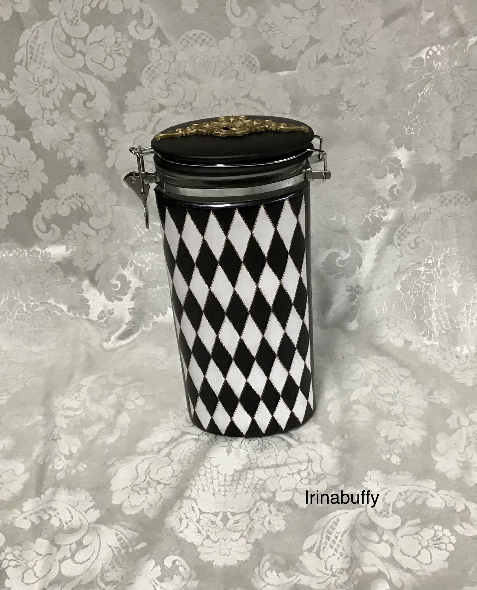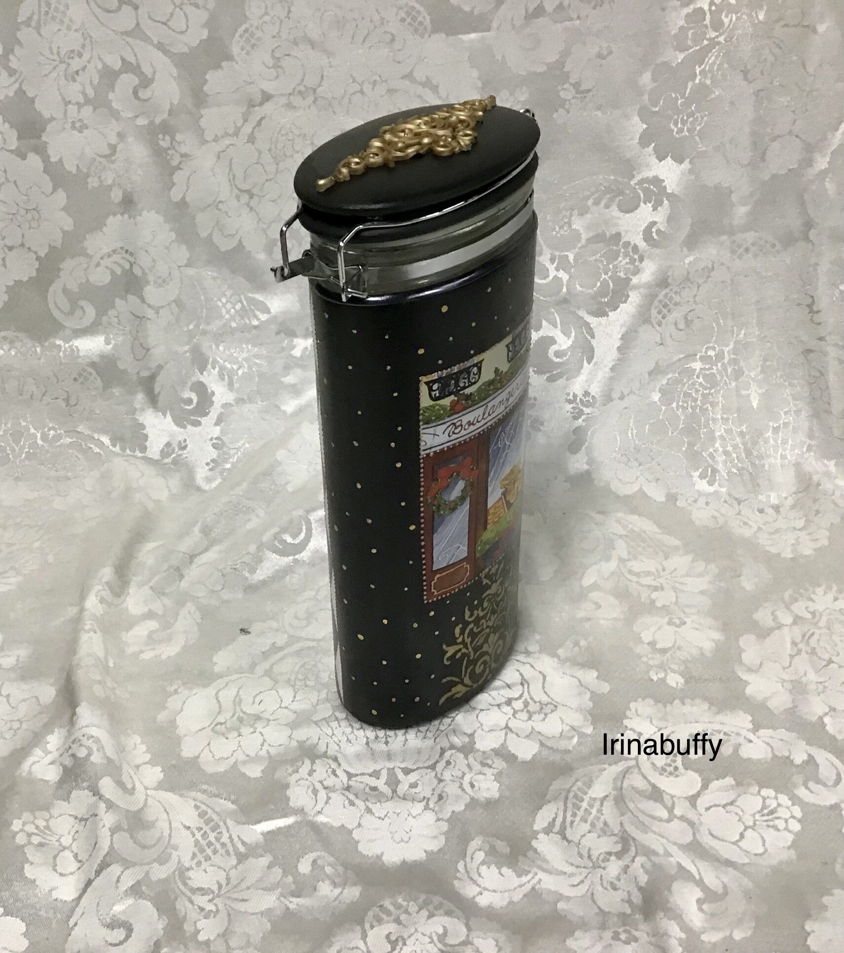 Другую сторону с картинкой покрасила в чёрный цвет, добавила золотые контур и рисунок через трафарет.