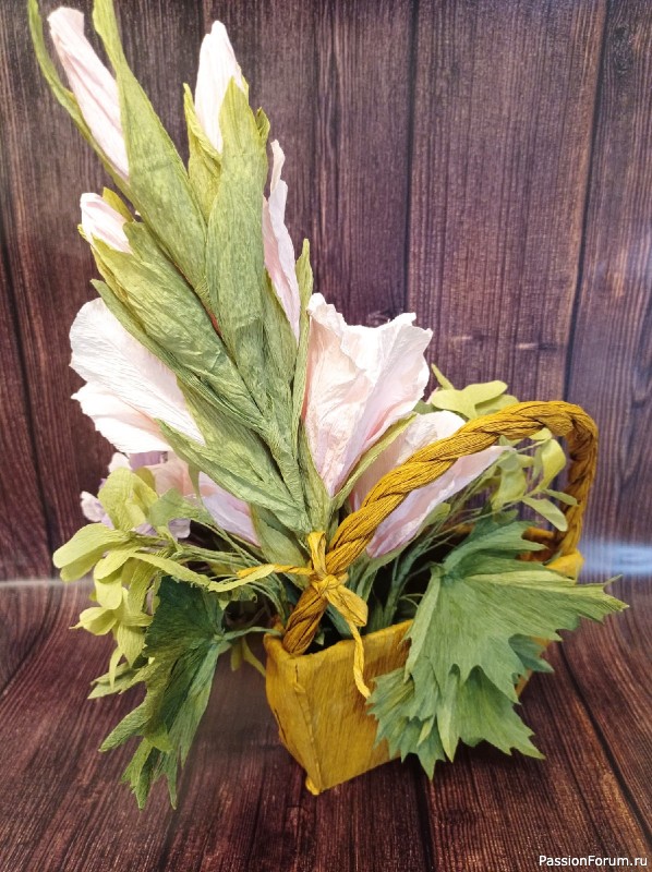 Вся композиция, включая корзинку, сделана из гофробумаги. Композиция состоит из трех видов цветов, нескольких веточек с семенами - "вертолетиками" и кленовой веточки.